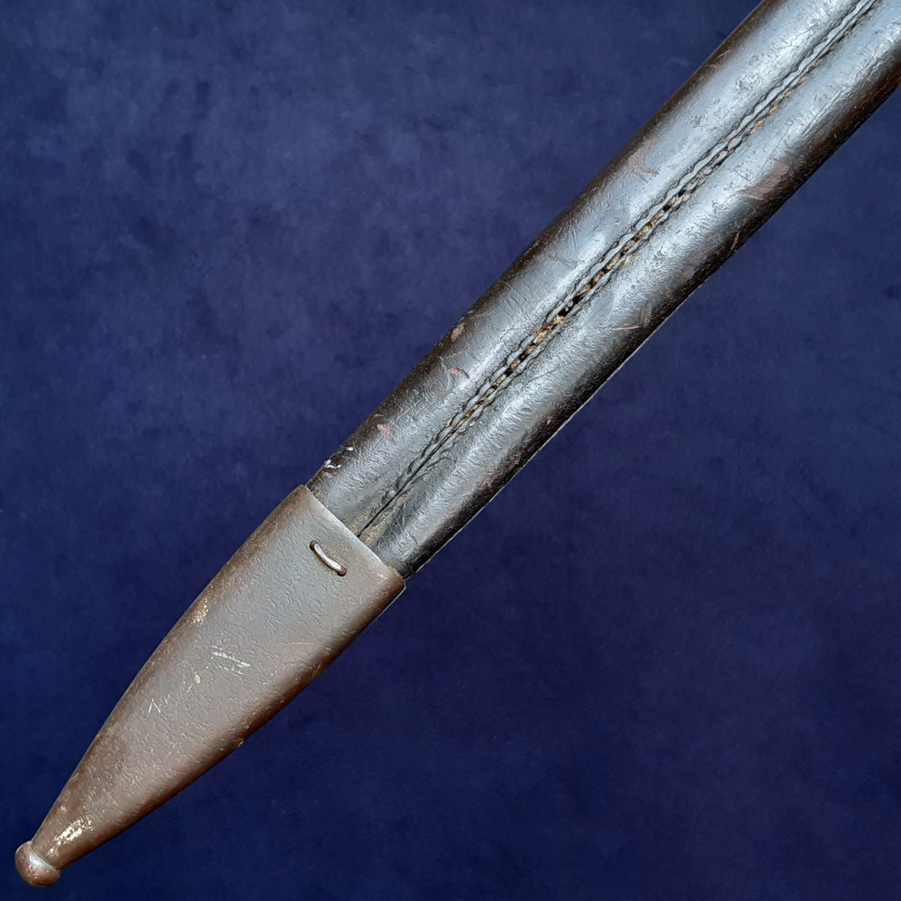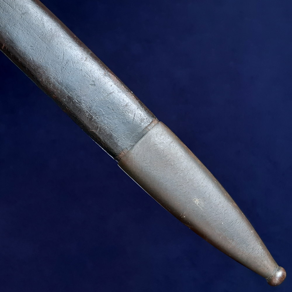 Some light patination to the blade overall, with a few darker spots. The hilt and pommel were originally painted black and much of this is still present, with some wear exposing patinated steel. Some dents and light handling wear to the wood grip. The pommel can rotate slightly in place, although the grip is solid in the hand. The seam of the scabbard has opened slightly in one section towards the chape. The scabbard fittings are darkly patinated with some scratching.