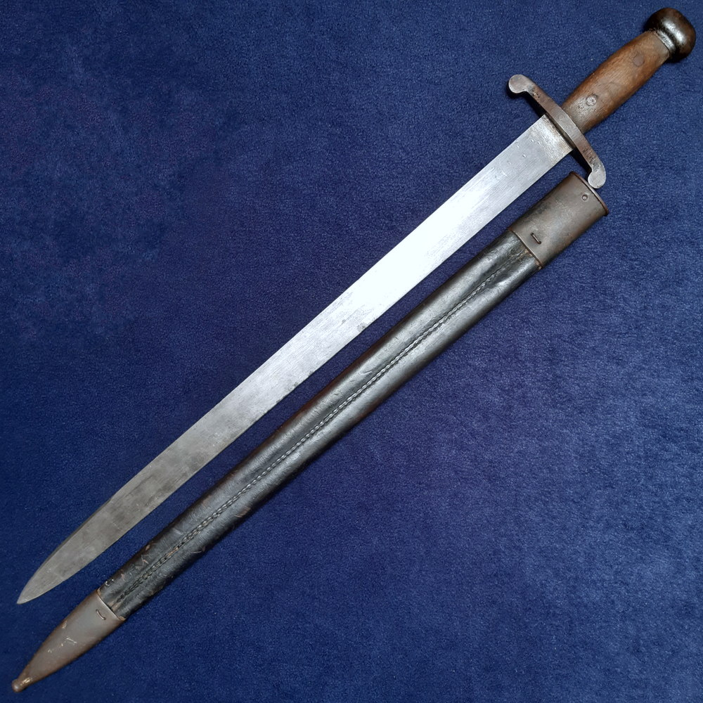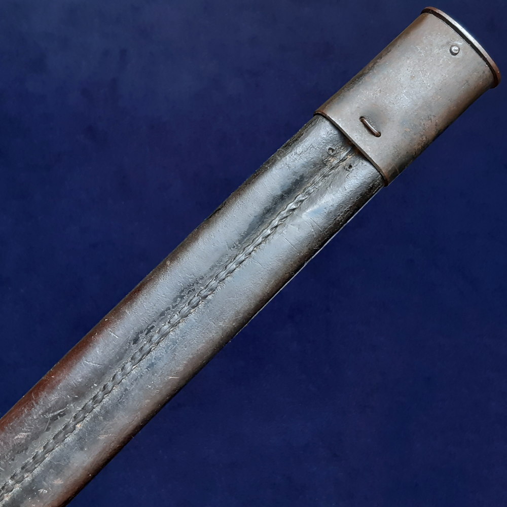 Multiple models of short sword emerged from this process – the version which was probably the first to be introduced (Kō) is referred to in sources as 砲兵刀 (Artillery Sword). It had a cast brass hilt and grip, and a black leather scabbard with brass throat and chape pieces, showing clear influence from the German faschinenmesser sidearms of the 19th century, particularly the M1852. The machine-made blade fullered only on one side is also very European, reminding me of the Vetterli bayonet, Saxon artillery sidearms or various Austrian models.