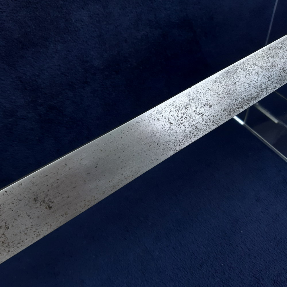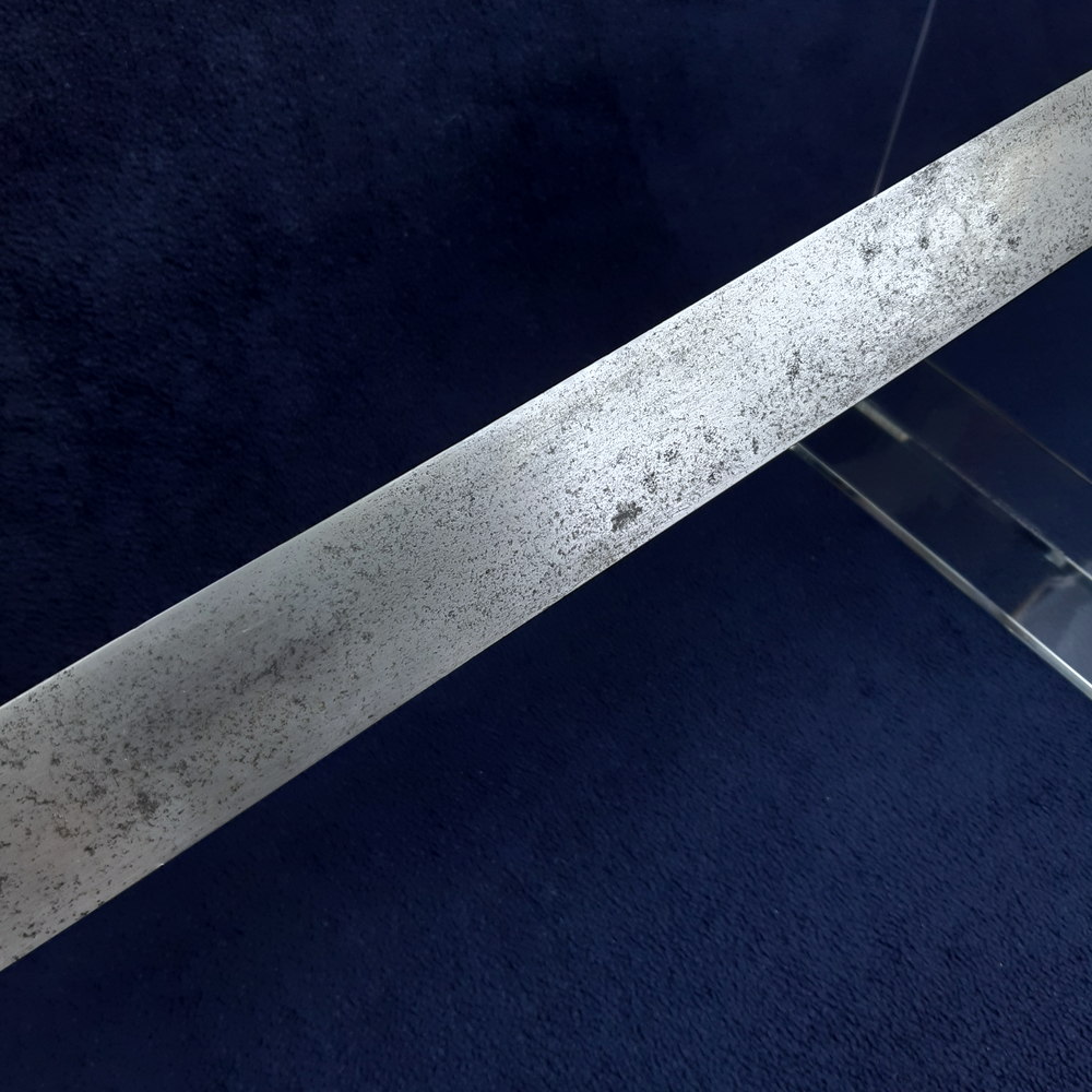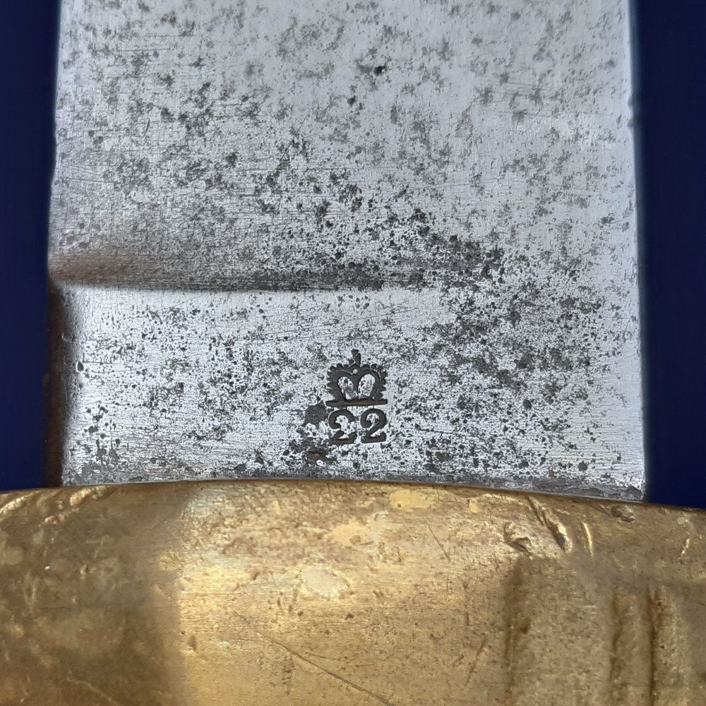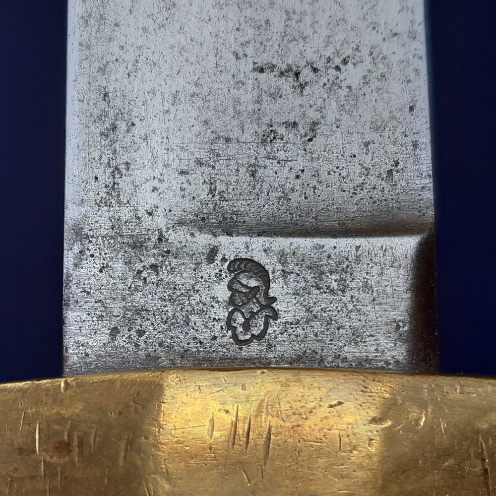 The ricasso of the blade is stamped on one side with a knight’s helm, this mark signifies the maker as C F Kirschbaum of Solingen. Imported German blades are not uncommon on British swords of the period, even those produced for the government. English firms would often buy in German blades then hilt and finish them. On the other side it is stamped with a crown inspection mark.