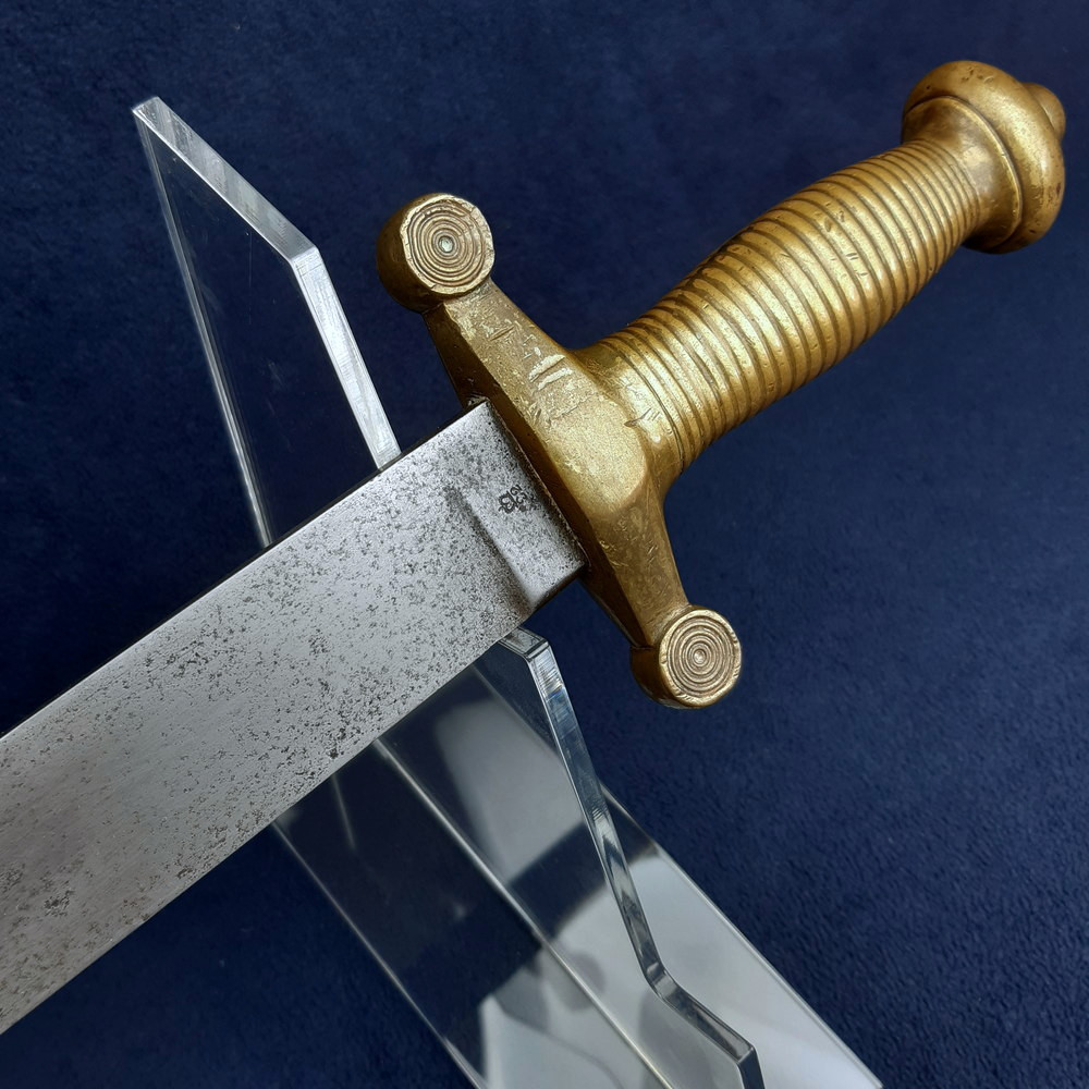 Straight unfullered single-edged blade. Ribbed solid brass hilt with cross guard, symmetrical round finials and oval pommel. No scabbard.