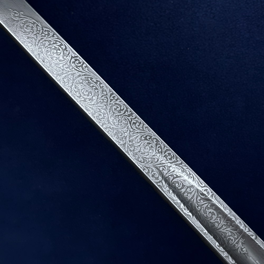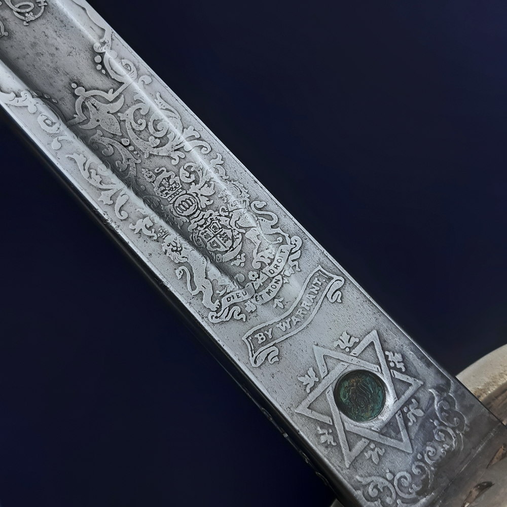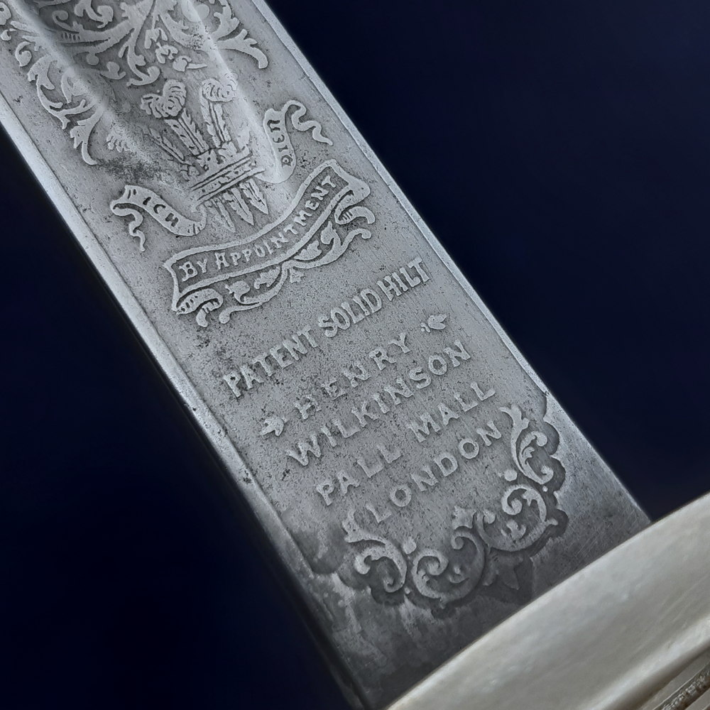 On one side the blade bears a brass proof slug at the ricasso stamped with ‘HW’, within an etched six-pointed star. Above this is etched the royal coat of arms and ‘BY WARRANT’, the crown, shield and cypher of Edward VII, and foliate motifs. There is a cartouche for the optional etching of the owner’s name, which has been filled with ‘CDAC’ in ornate script.