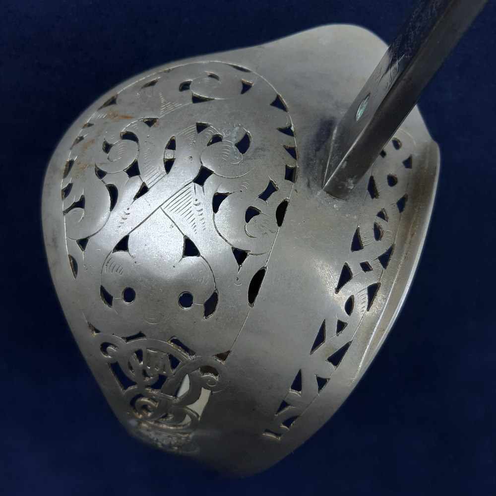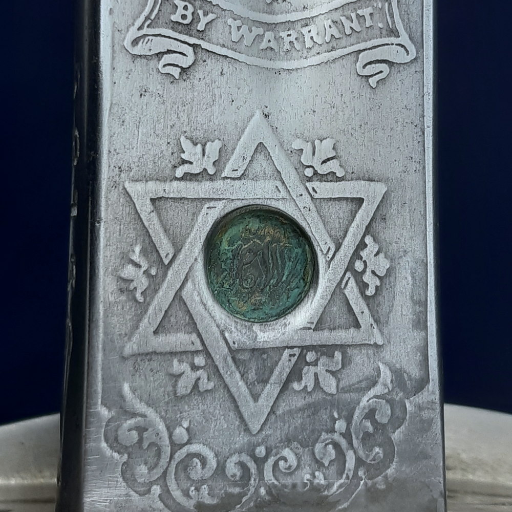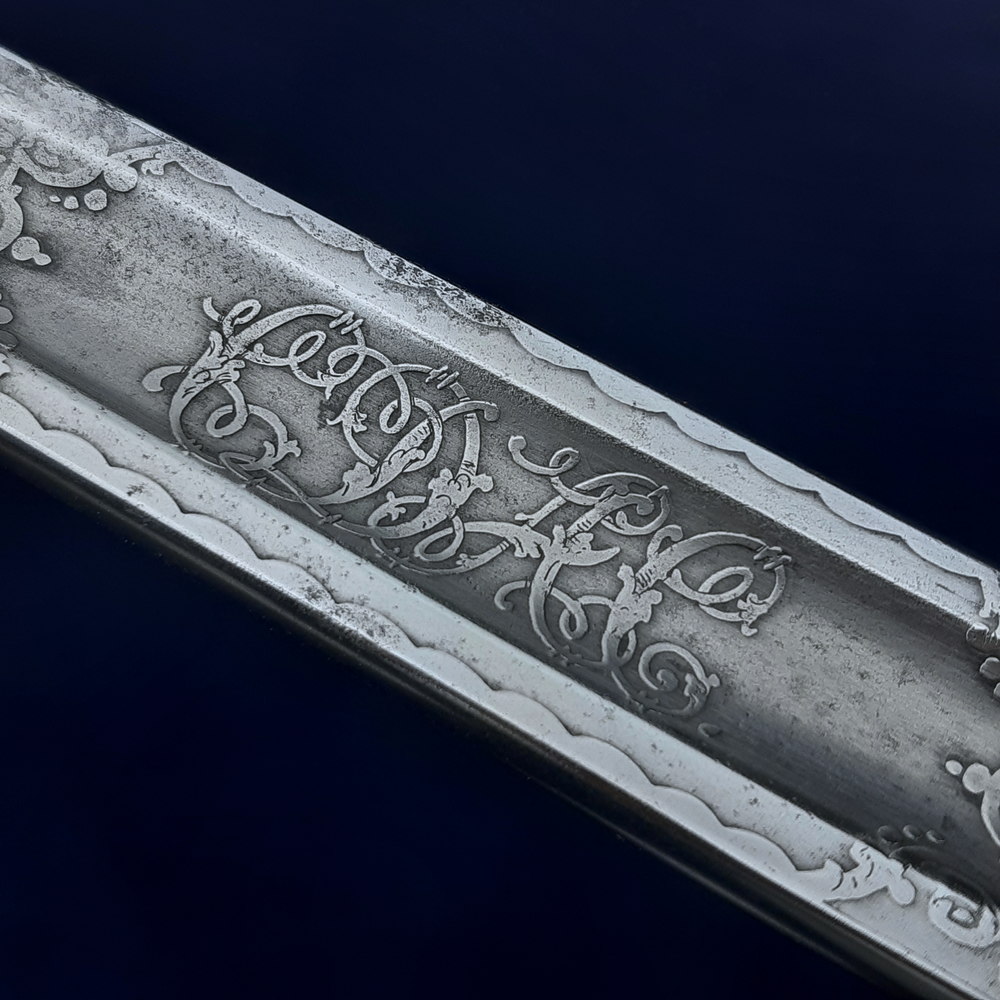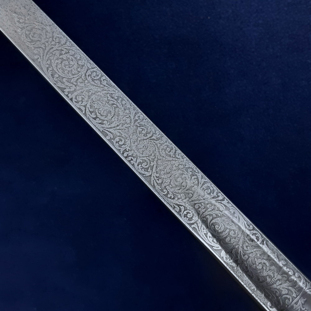 On one side the blade bears a brass proof slug at the ricasso stamped with ‘HW’, within an etched six-pointed star. Above this is etched the royal coat of arms and ‘BY WARRANT’, the crown, shield and cypher of Edward VII, and foliate motifs. There is a cartouche for the optional etching of the owner’s name, which has been filled with ‘CDAC’ in ornate script.