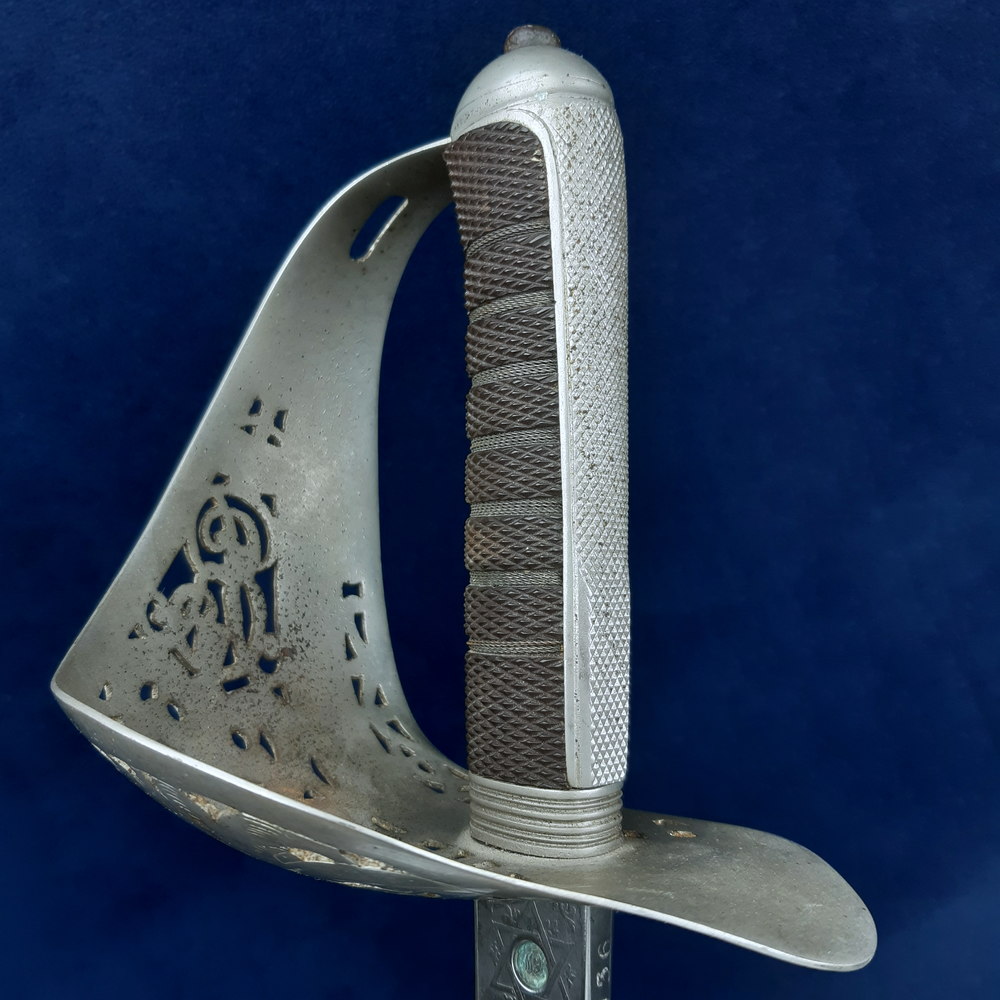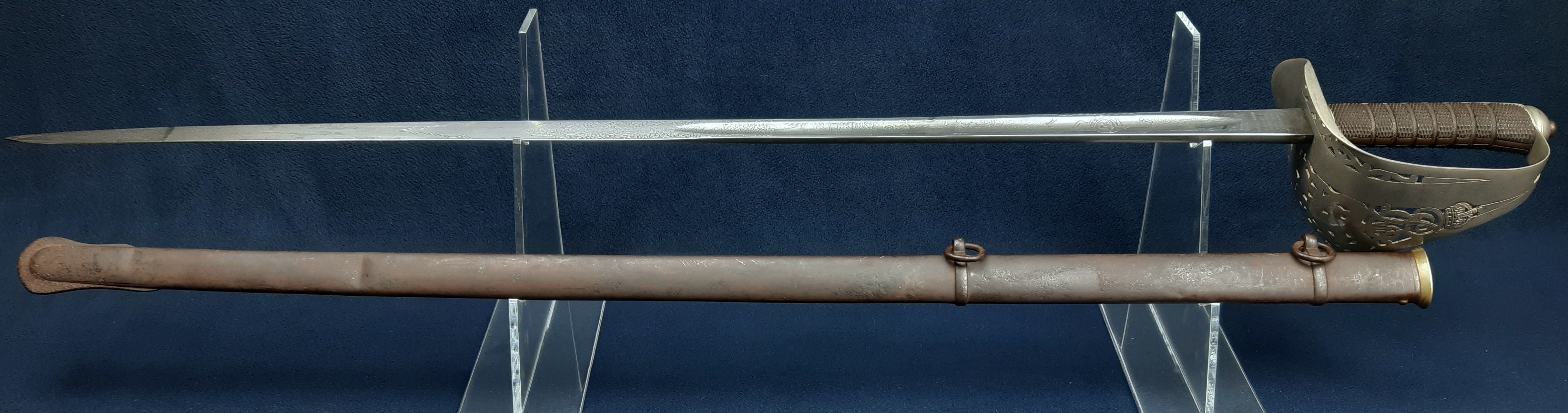 Straight single-fullered spear-pointed blade. Steel hilt with pierced decoration including the crown and royal cypher of King Edward VII. Fully chequered backstrap, integral oval pommel with tang button. ‘Patent Solid Hilt’ of chequered grip scales bound to an exposed full-width tang and wrapped with wire. No leather washer. Steel parade scabbard with brass throat piece and two hanging rings. Blade 32 inches in length, 1 1/16 inches wide at the shoulder, the sword 38 inches overall.