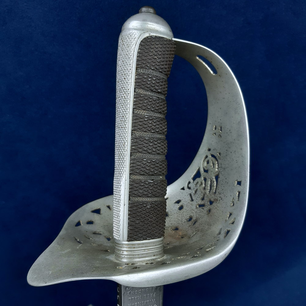 Developed by swordsmith Charles Reeves, who obtained a patent on the design in 1853, the ‘Patent Solid Hilt’ incorporated a tang that ran the full width of a sword’s grip. A full-width tang resulted in a stronger weapon, a common point of breakage being at the shoulder where the blade would traditionally abruptly narrow into a slender tang that ran through the centre of the grip. The Patent hilt was a relatively expensive optional extra applied to an individual officer’s sword upon request at the point of purchase. Applied to various sword Patterns over the years, it made sense as a purchase for an officer who was expecting serious combat or had disposable income for a top-of-the-line weapon: Claud would clearly fall into both categories. By the time of this sword’s purchase Wilkinson was the holder of the patent, having absorbed Reeves’s company in the 1880s.