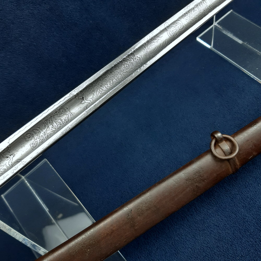 The blade has no damage to its edge and only a few tiny spots of patination, some of these among the etching. The etching is crisp with some very light rubbing to the foliate pattern beyond the end of the fuller due to sheathing and drawing. Some light verdigris to the proof slug. The chequered grip is all intact and its diamonds sharp with no notable handling wear, the wire binding is all present and tight. The exposed tang of the blade has an even grey patina. The nickel plating of the hilt parts is very good with only a few tiny specks of wear revealing patinated steel in the usual areas including inside the guard where fingers would rub against it when carried. Some tiny spots of staining on the outer guard.