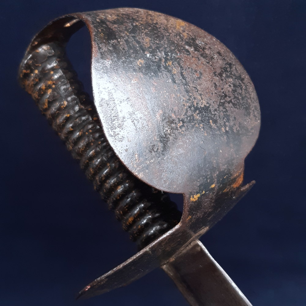 The blade is unsharpened with a few small dents to its edge and a slightly rolled tip (~1mm). Its surface has areas of patination, light scratching, spots of light pitting in the fuller and around the tip. The hilt and grip have the common black japanned finish, but have also been painted with an unusual tan colour. It is difficult to tell which was applied first but more of the tan remains, particularly on the inside of the hilt. Both have rubbing and flaking exposing heavily patinated iron. Slight rotational movement to the grip.