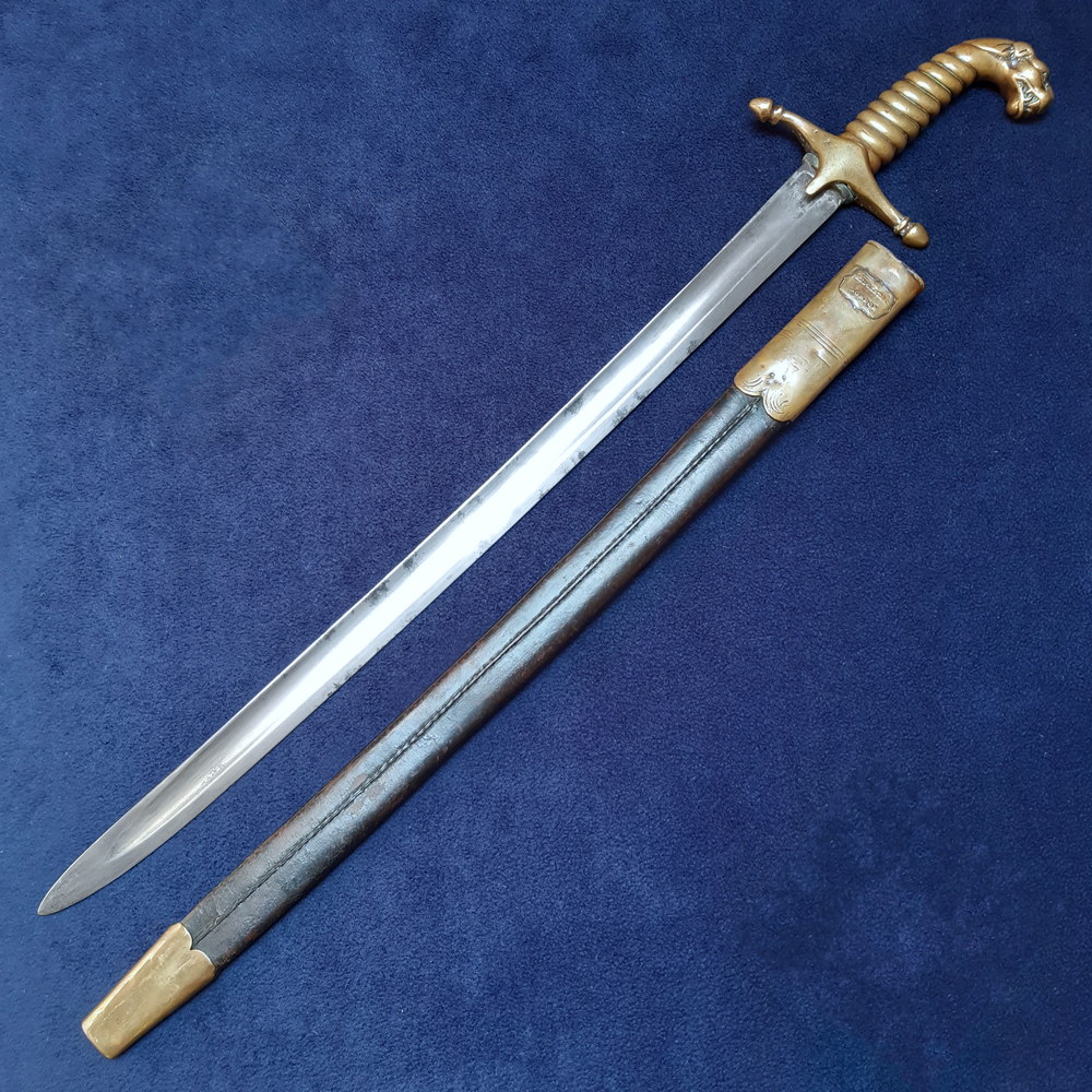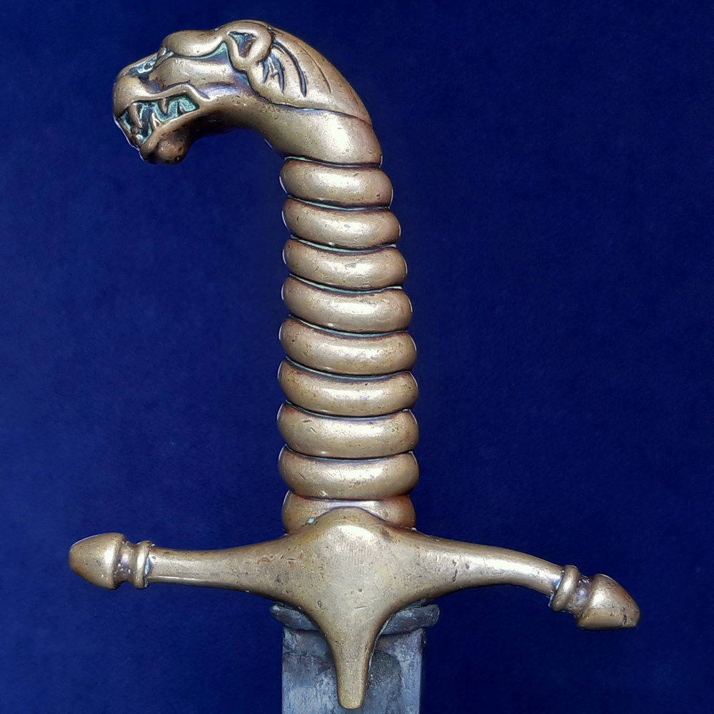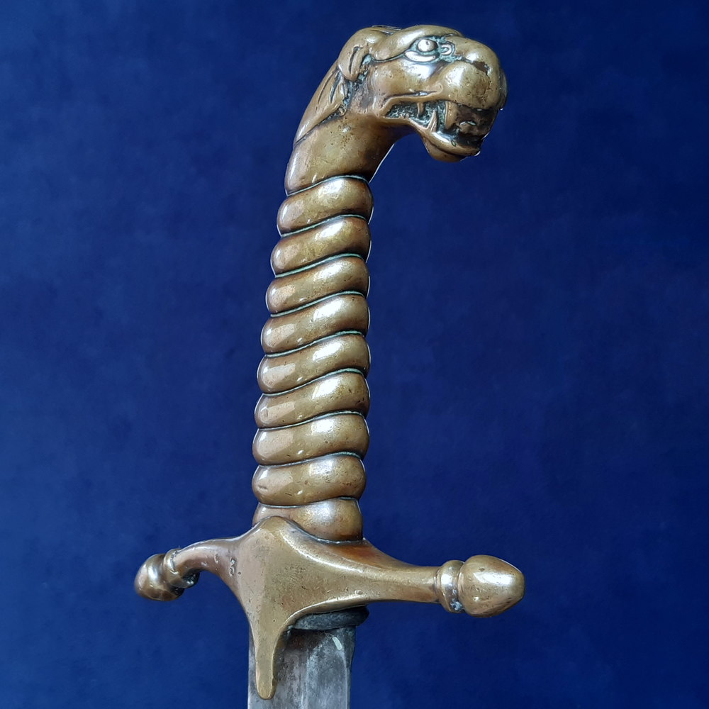 There was no standard pattern for the ornamental swords carried by military bands in the 18th and early 19th centuries. Each regiment was responsible for equipping its band as it saw fit, and took pride in outdoing each other in their parade dress. Nonetheless there was a common style: a short, usually curved mameluke-style sword with brass fittings and a pommel in the form of an animal head, most often a lion.