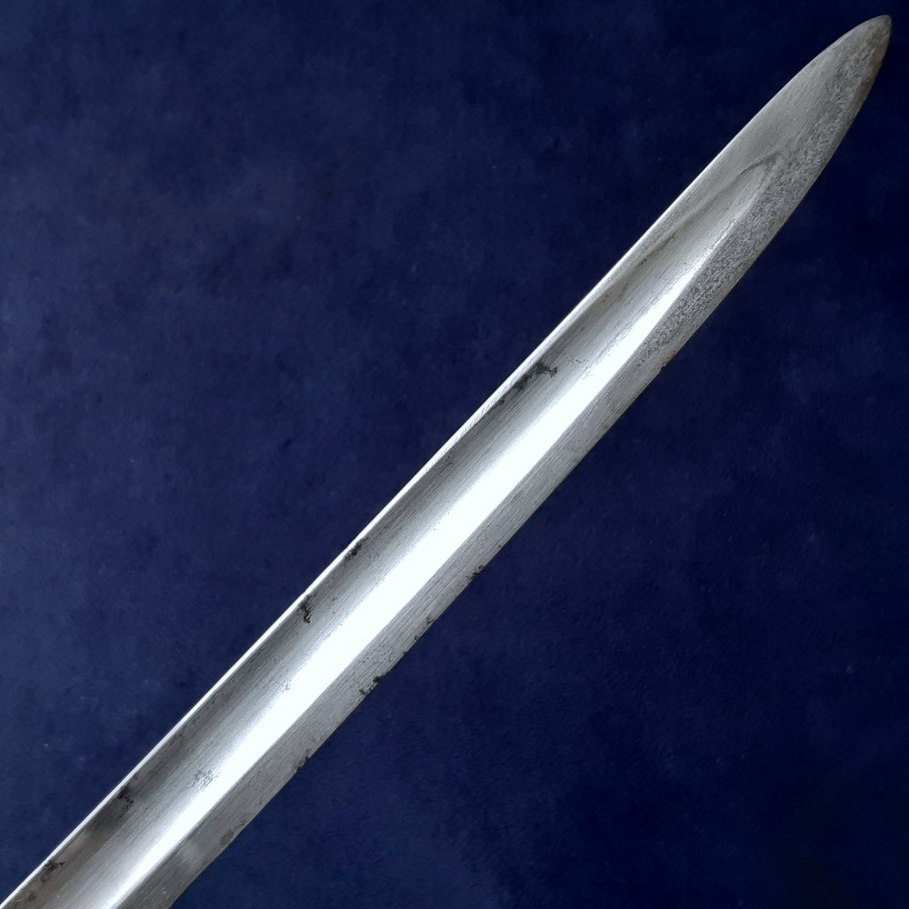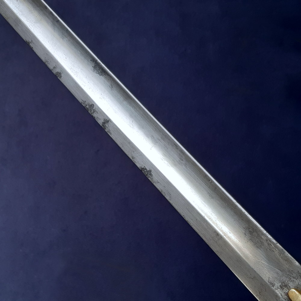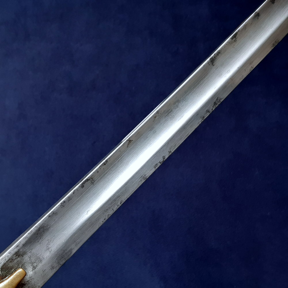 I think this may be an interesting transitional example: a bandsman’s sword produced in the early 19th century, subsequently shortened to resemble the regulation pattern that replaced it. The 1856 Pattern drummer’s sword has a blade 19½ inches long, while this piece has been shortened to 20 inches – which given its slightly shorter hilt brings it to 24½ inches in total, exactly the same length as the 1856 Pattern. It is known that in practice some regiments went a number of years before adopting the 1856, e.g. the 31st Foot took until 1863. This piece may be evidence of what such units did in the interim.