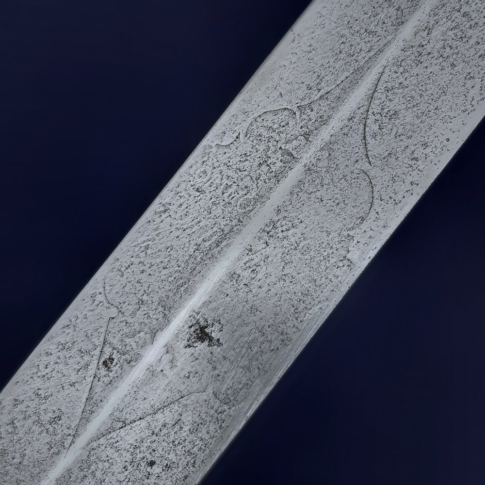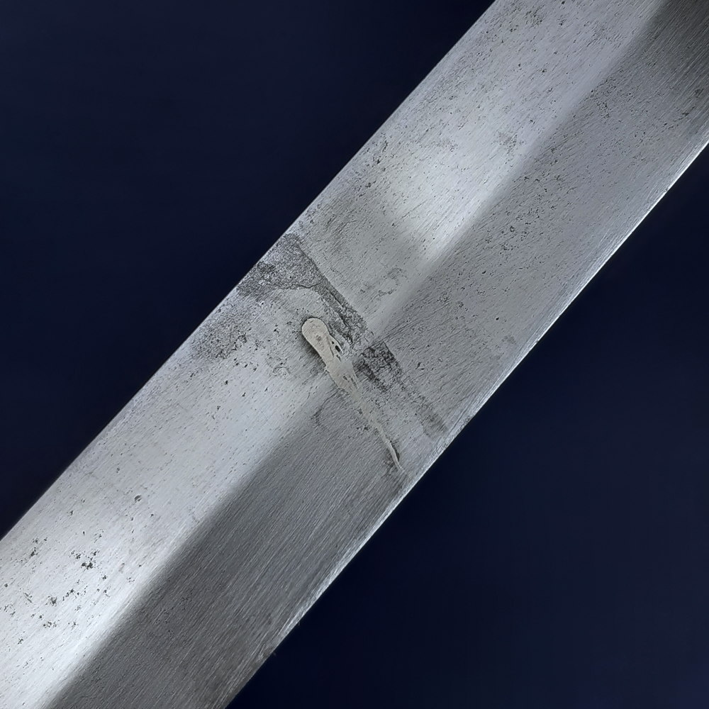 The blade has light speckled patination. Some rubbing to the etching, leaving the maker’s mark in particular faint. No damage to the edge, which is unsharpened on both sides. One repair to the blade at the midsection on one side. The nickel plating of the brass parts is excellent, bright and clean with only one tiny area of wear at the base of a quillon on one side, the revealed brass with verdigris. Light The leather of the scabbard has some surface-level cracking and small areas of flaking in places, its stitching is all intact. The chape piece of the scabbard is missing its staple but seems firmly attached regardless. The hilt and grip appear to have been repeened, consistent with the sword having been taken apart for chrome plating. This has not had any adverse effect - the blade is rock solid and rings when tapped.