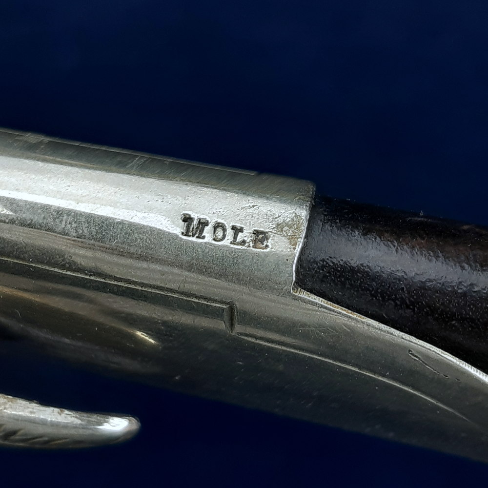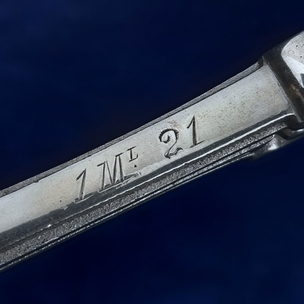 The blade is etched on one side with ‘MIDLOTHIAN RIFLE VOLUNTEERS BAND’, above which is a bugle emblem, enclosing the text ‘1st’, all this within a cartouche. It is etched on the other side with the maker’s mark ‘ROBT MOLE & SONS’ also within a cartouche, indicating the maker Robert Mole & Sons. The side of the grip is engraved with ‘1 ML 21’. The throat piece of the scabbard is similarly engraved with ‘1 ML 5’. 21 and 5 are probably rack numbers, and suggest that the scabbard was swapped with at one point, perhaps while in regimental stores. The throat piece of the scabbard is stamped on one side with the maker’s mark ‘MOLE’.