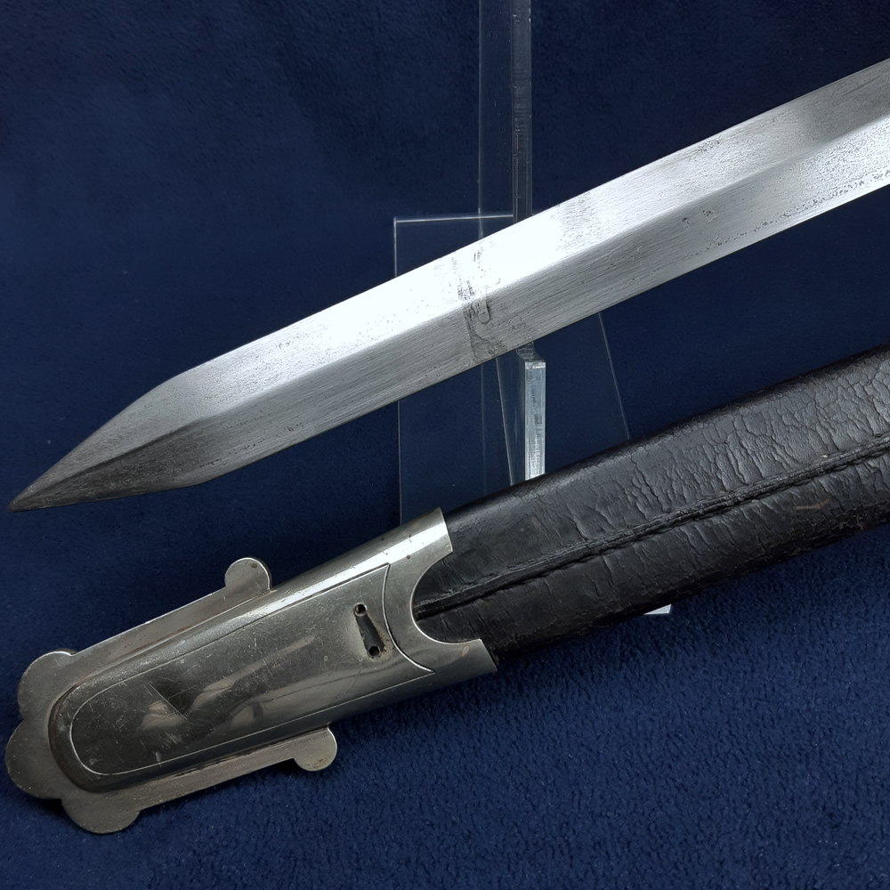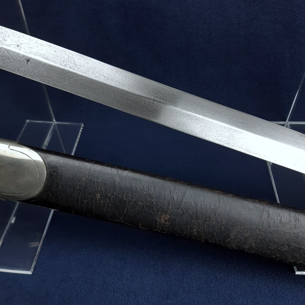Straight unfullered double-edged spear-pointed blade with diamond cross-section, nickel-plated brass hilt with central VR cypher of Queen Victoria, triangular langets and trefoil finials. Brown leather washer. Longitudinally ribbed brass grip, flared pommel. Black leather scabbard with plated brass fittings at throat and chape, the throat piece with teardrop-shaped frog stud bearing incised decoration.