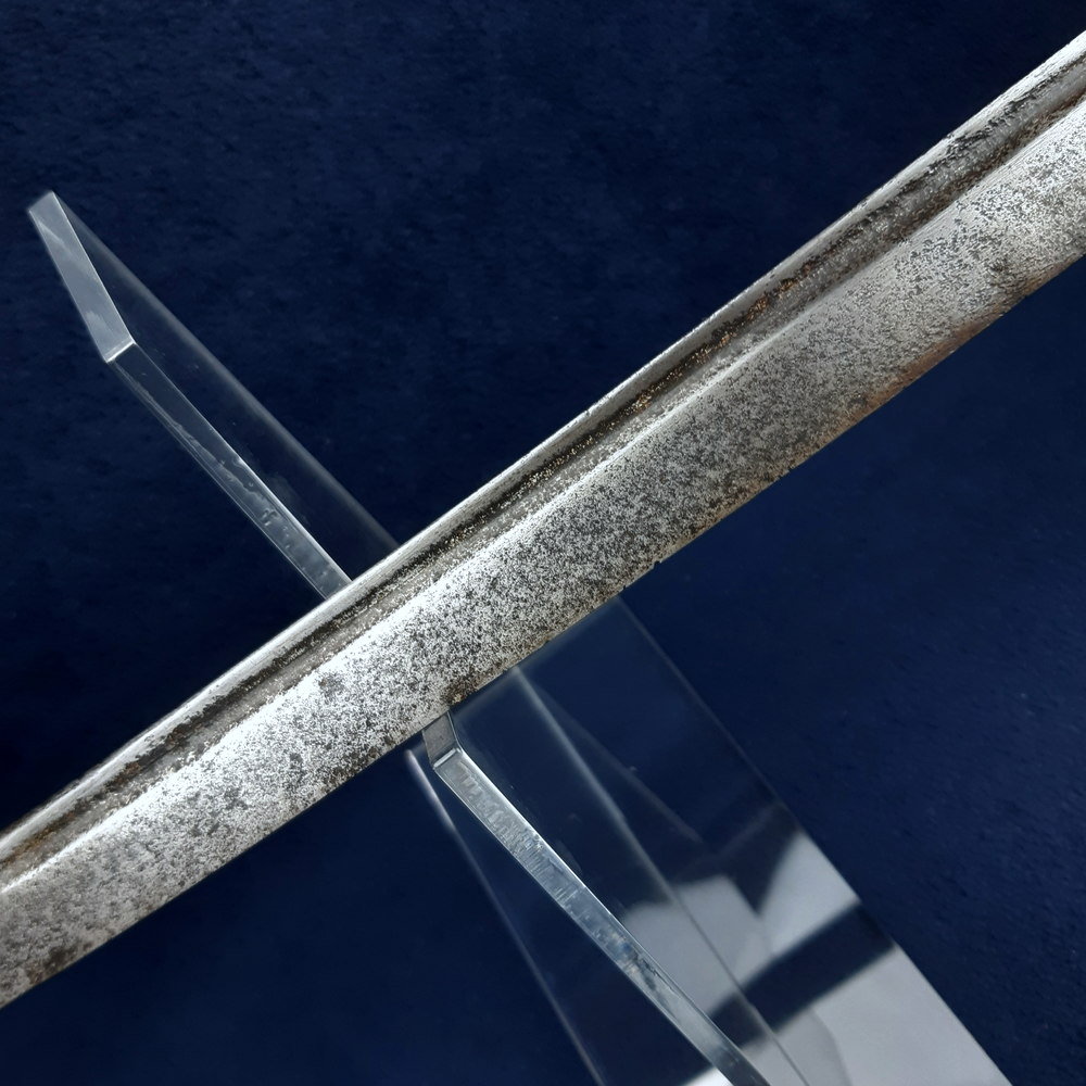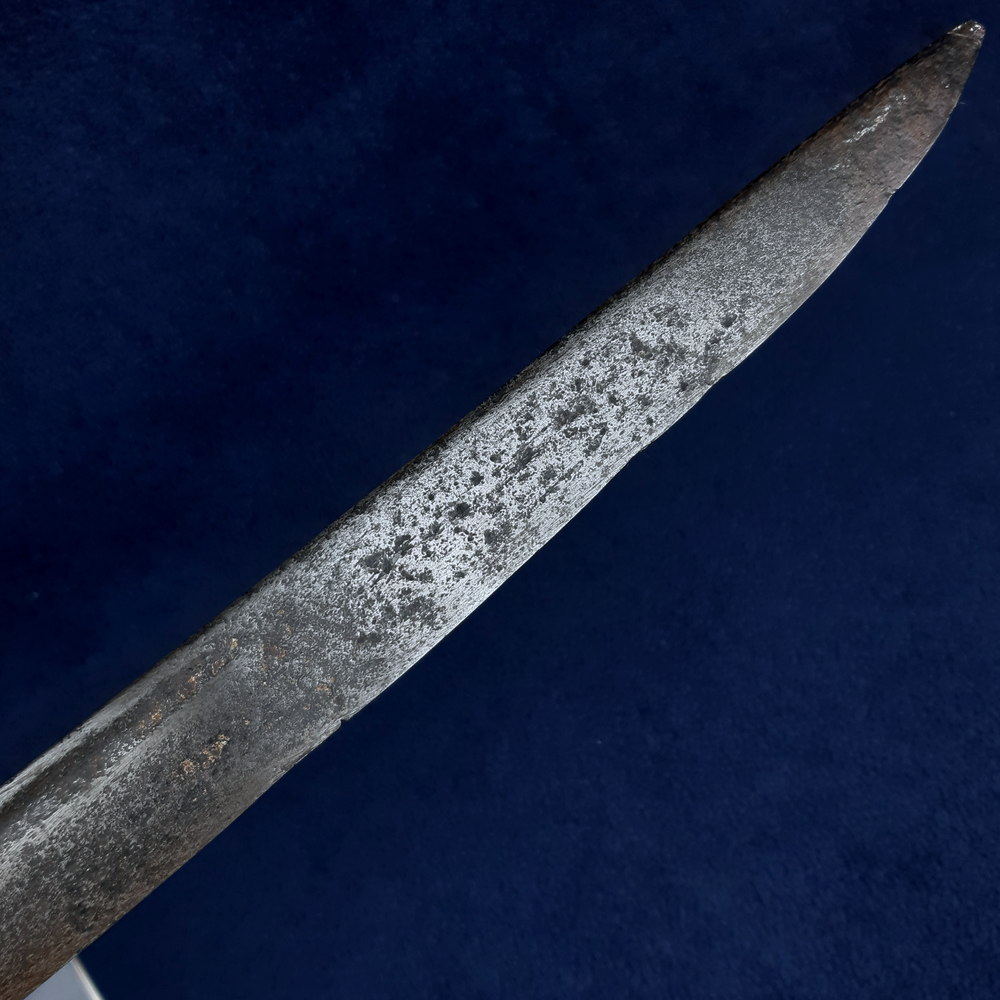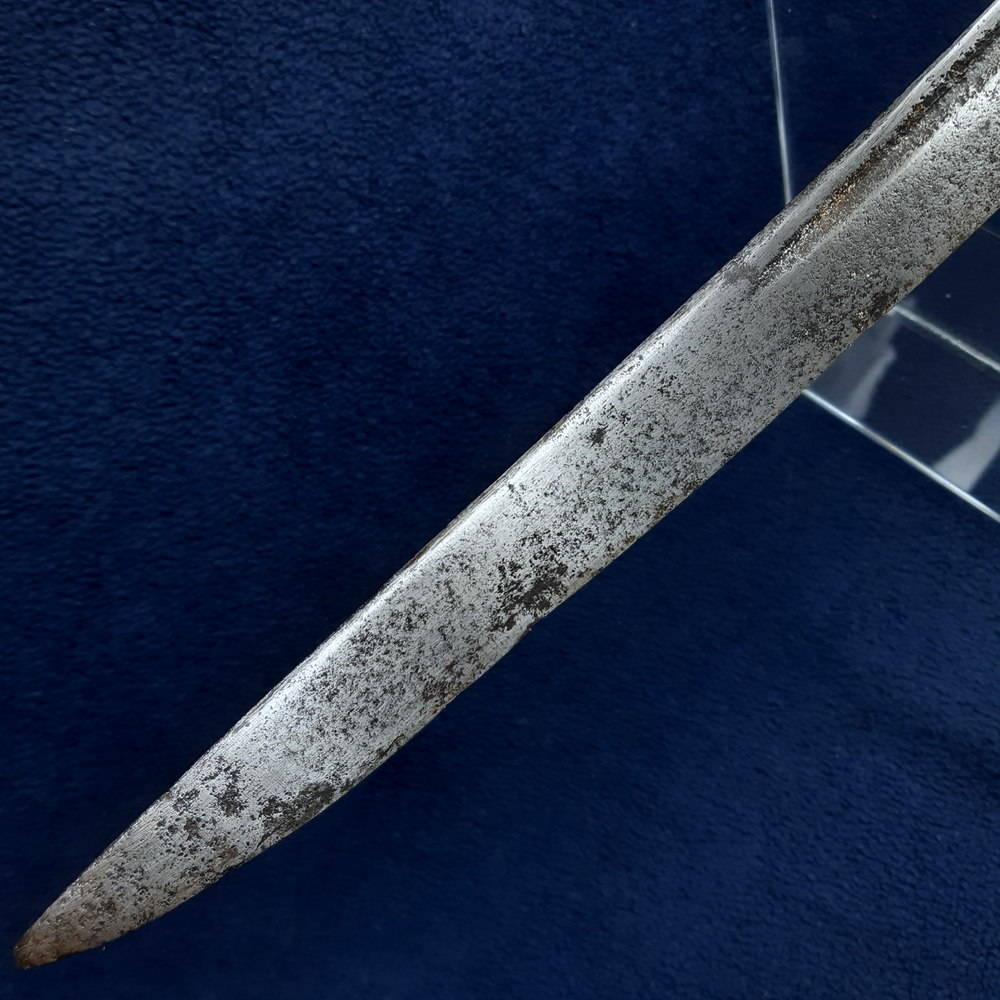The blade has been sharpened, with a number of nicks to its edge, some shallow notches near the tip. The tip itself is rounded and fractionally bent to the right in its last 3mm. It has patches of patination overall, some light pitting to the iron at the forte of the blade spotted heavier pitting near the tip. The brass parts have moderate patination and a few dents, including a larger one to the pommel. No cracks to the hilt bars. The short quillon usually found on this type has been lost. Slight movement of the hilt side to side, while the grip itself remains firm.