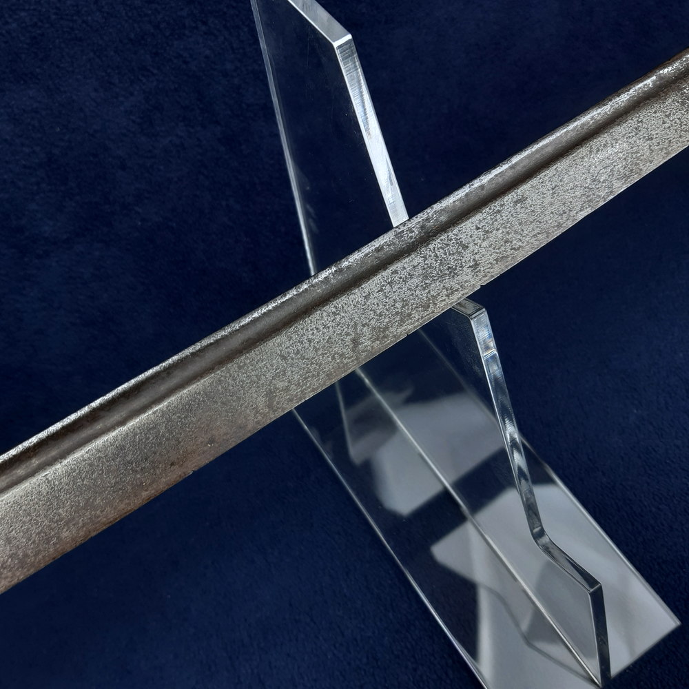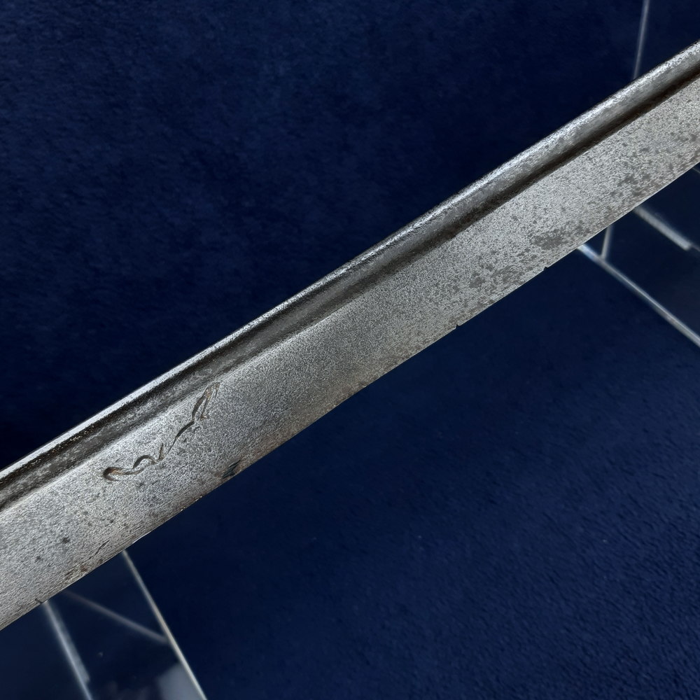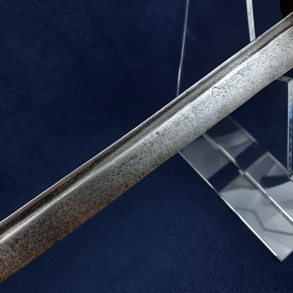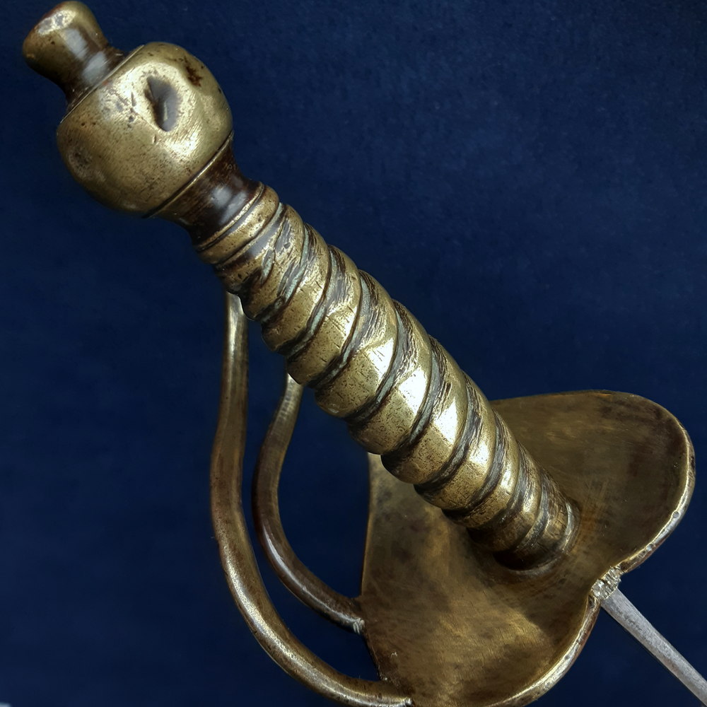 The blade has been sharpened, with a number of nicks to its edge, some shallow notches near the tip. The tip itself is rounded and fractionally bent to the right in its last 3mm. It has patches of patination overall, some light pitting to the iron at the forte of the blade spotted heavier pitting near the tip. The brass parts have moderate patination and a few dents, including a larger one to the pommel. No cracks to the hilt bars. The short quillon usually found on this type has been lost. Slight movement of the hilt side to side, while the grip itself remains firm.