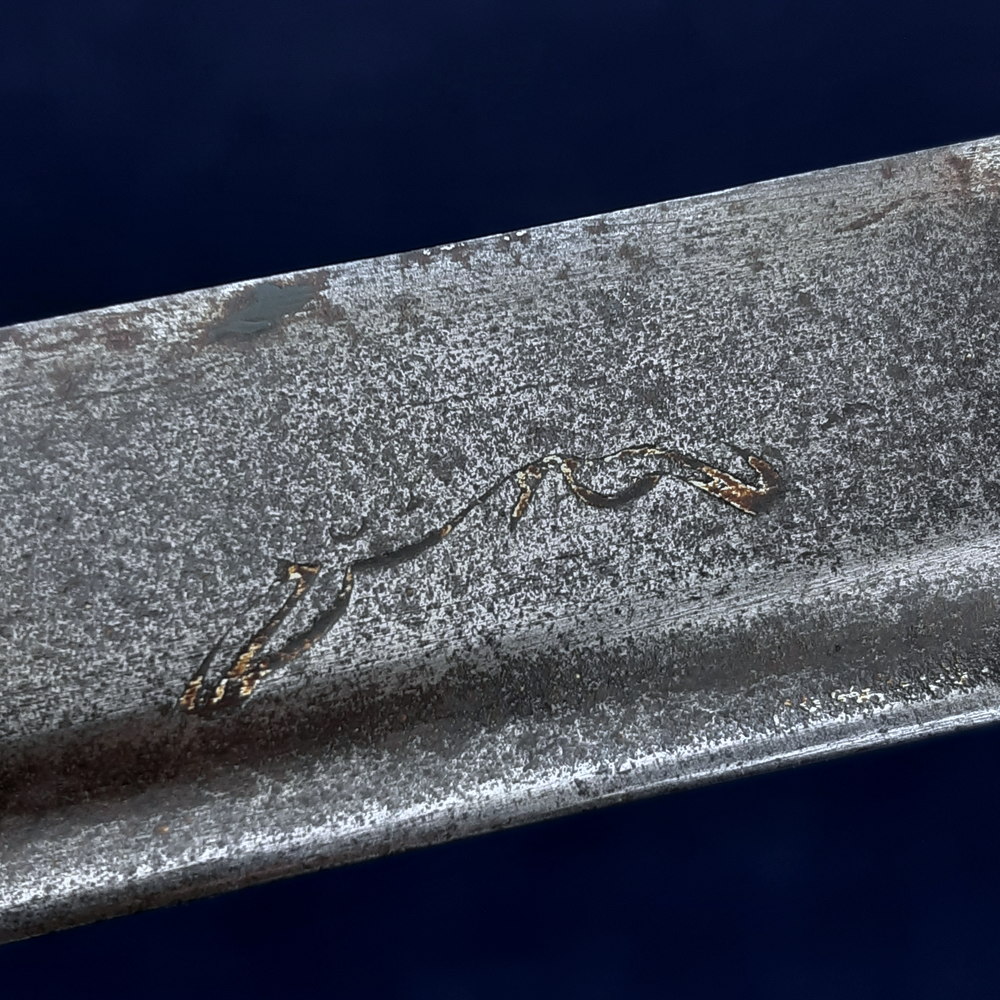 The outside of the hilt is engraved with ‘YORK – W-R – 2 – DB’, indicating issue to the 2nd West Riding Militia a.k.a. 2nd Regiment of West Yorkshire Militia and ‘1 / 31’, most likely a rack number. The blade is stamped on both sides with a running fox within which are the initials ‘SH’, indicating the maker Samuel Harvey. It is also stamped at the shoulder on one side with a crown mark. This indicates government inspection or ownership and suggests this hanger was part of an officially ordered production run.