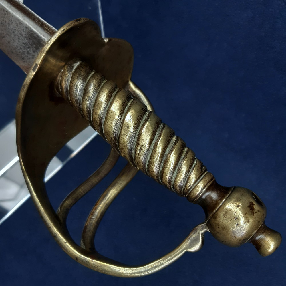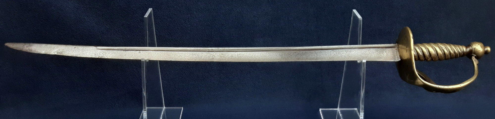 The ‘1751 Pattern’ is not an official pattern of British sword (built to specifications set by the military establishment) but a widely used type that appeared around that date, was purchased officially to some degree and issued to many regiments. In this era colonels of regiments typically controlled procurement of equipment but market availability affected their choices and some larger-scale ordering took place. The 1751 is simple and durable, its blade typical of the British ‘hanger’, and survives in some numbers today considering its age. Almost all examples are marked to a militia unit.