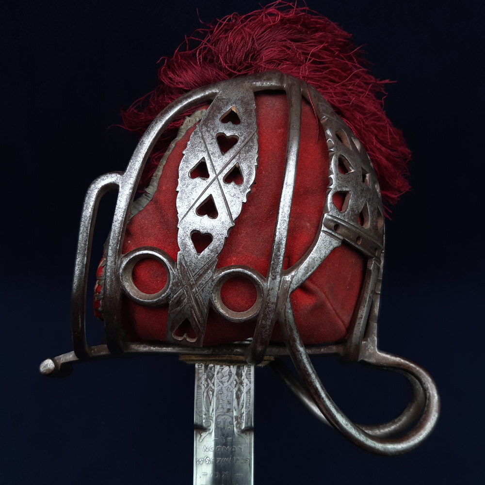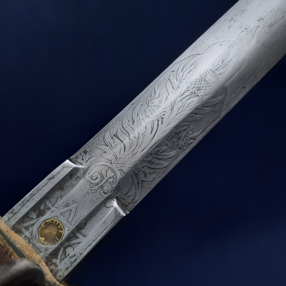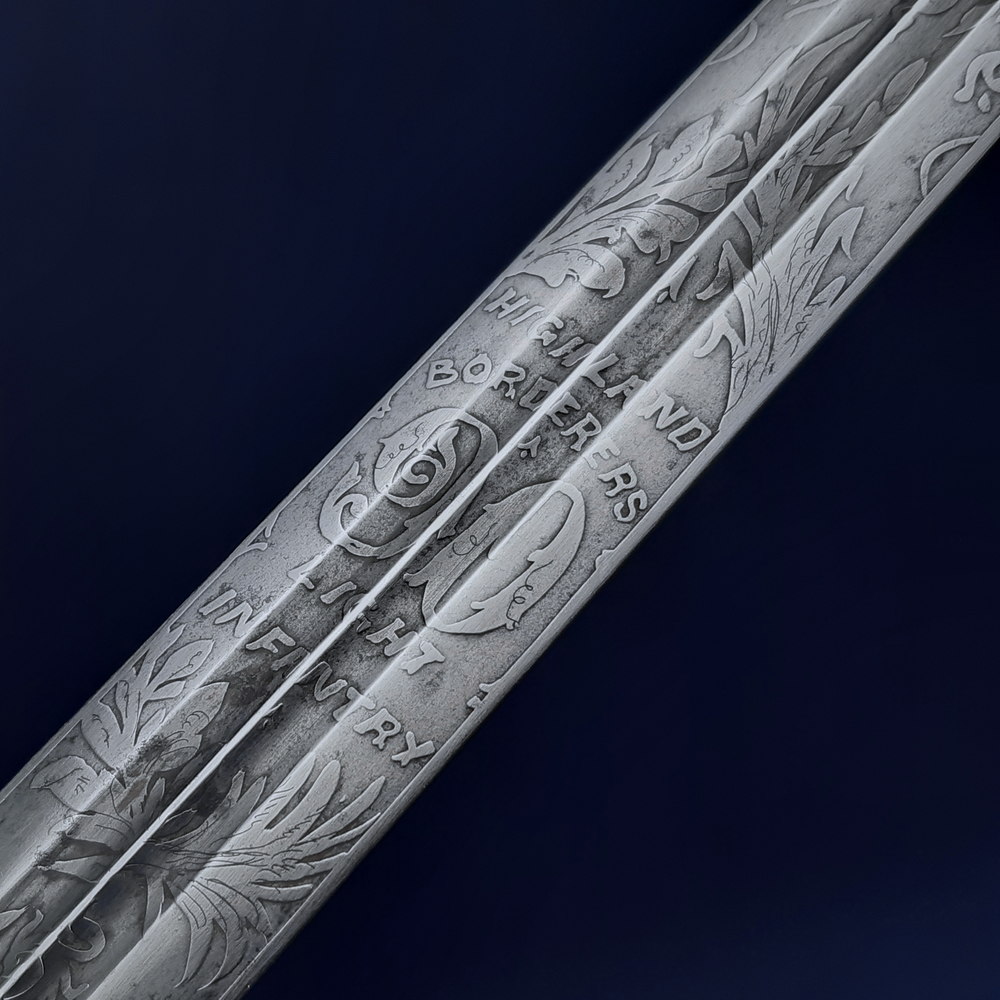 The traditionally-styled Scottish broadsword was carried exclusively by Highland infantry regiments until 1881, when the Lowland regiments adopted Scottish dress and the broadsword along with it (with the exception of the Cameronians aka Scottish Rifles). This example does not have an interchangeable hilt, it is peened permanently in place. Interchangeable hilts are a feature that dates back to the 1860s and were first officially mentioned in the Dress Regulations of 1883. This would normally be a helpful feature for dating but it should be noted that Scottish volunteer and militia swords are typically non-interchangeable even in later periods.