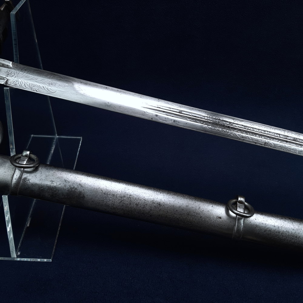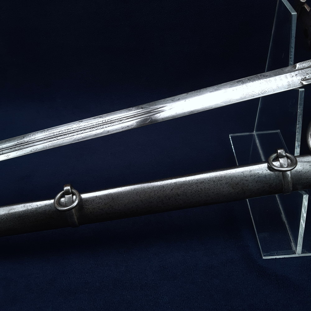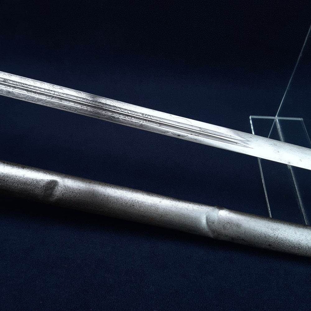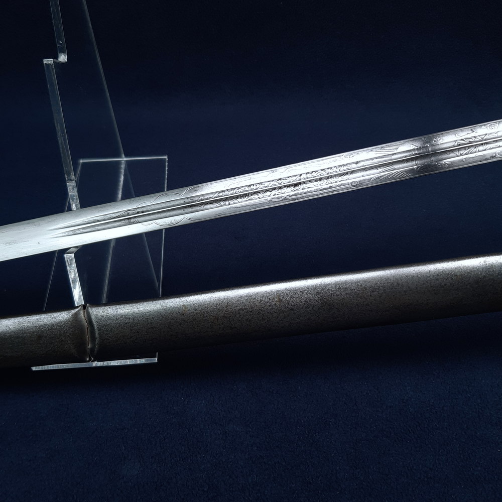 The blade is bright with only a few small spots of patination, some of these among the etching. Its edge is unsharpened and undamaged. The shagreen of the grip is all intact with very light handling wear, its wire binding is all present and tight. The sword is solid in the hand with only very fractional movement of the ferrule.