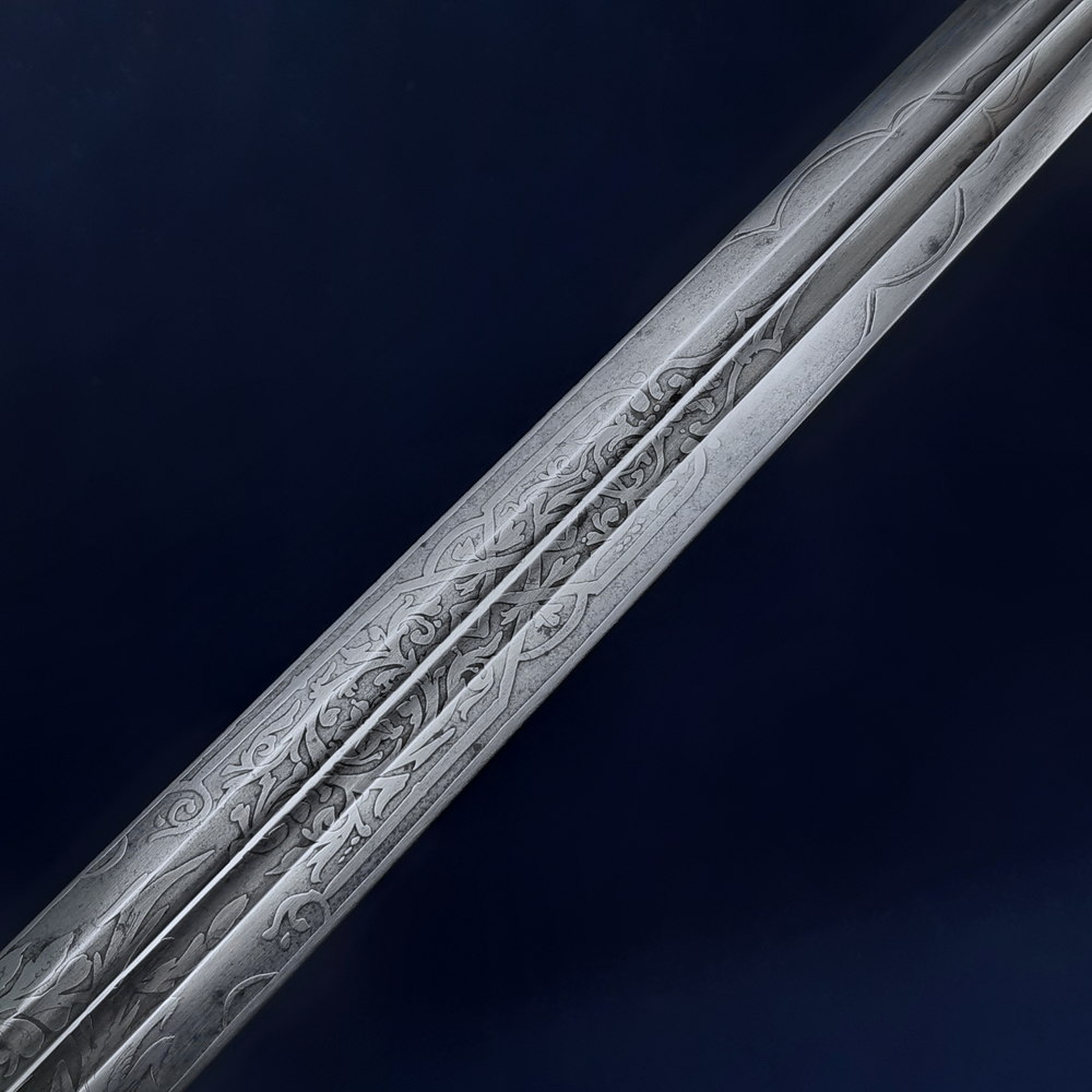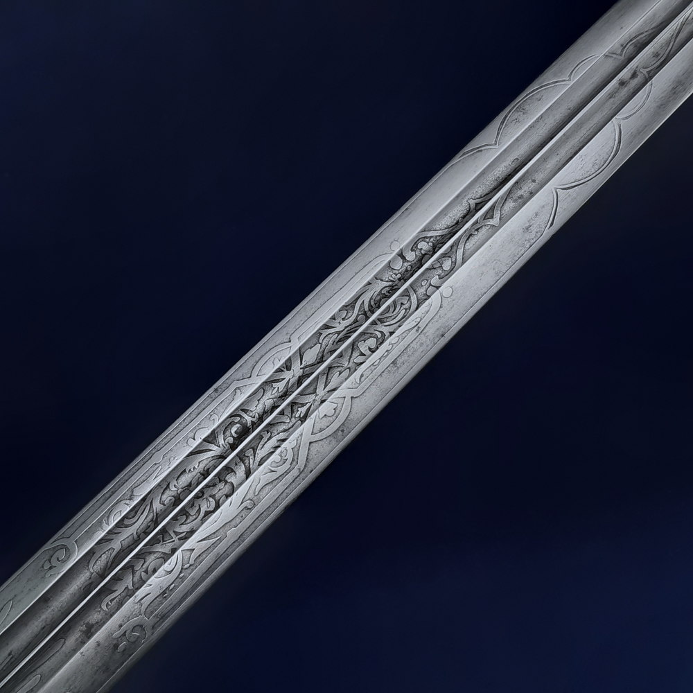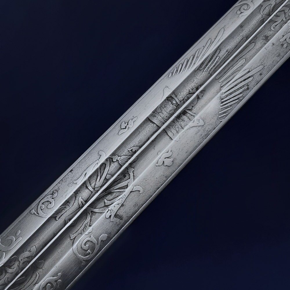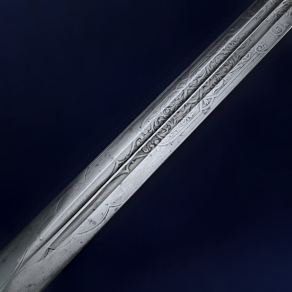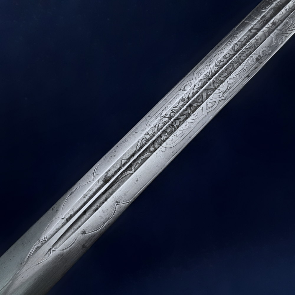 The blade is bright with only a few small spots of patination, some of these among the etching. Its edge is unsharpened and undamaged. The shagreen of the grip is all intact with very light handling wear, its wire binding is all present and tight. The sword is solid in the hand with only very fractional movement of the ferrule.