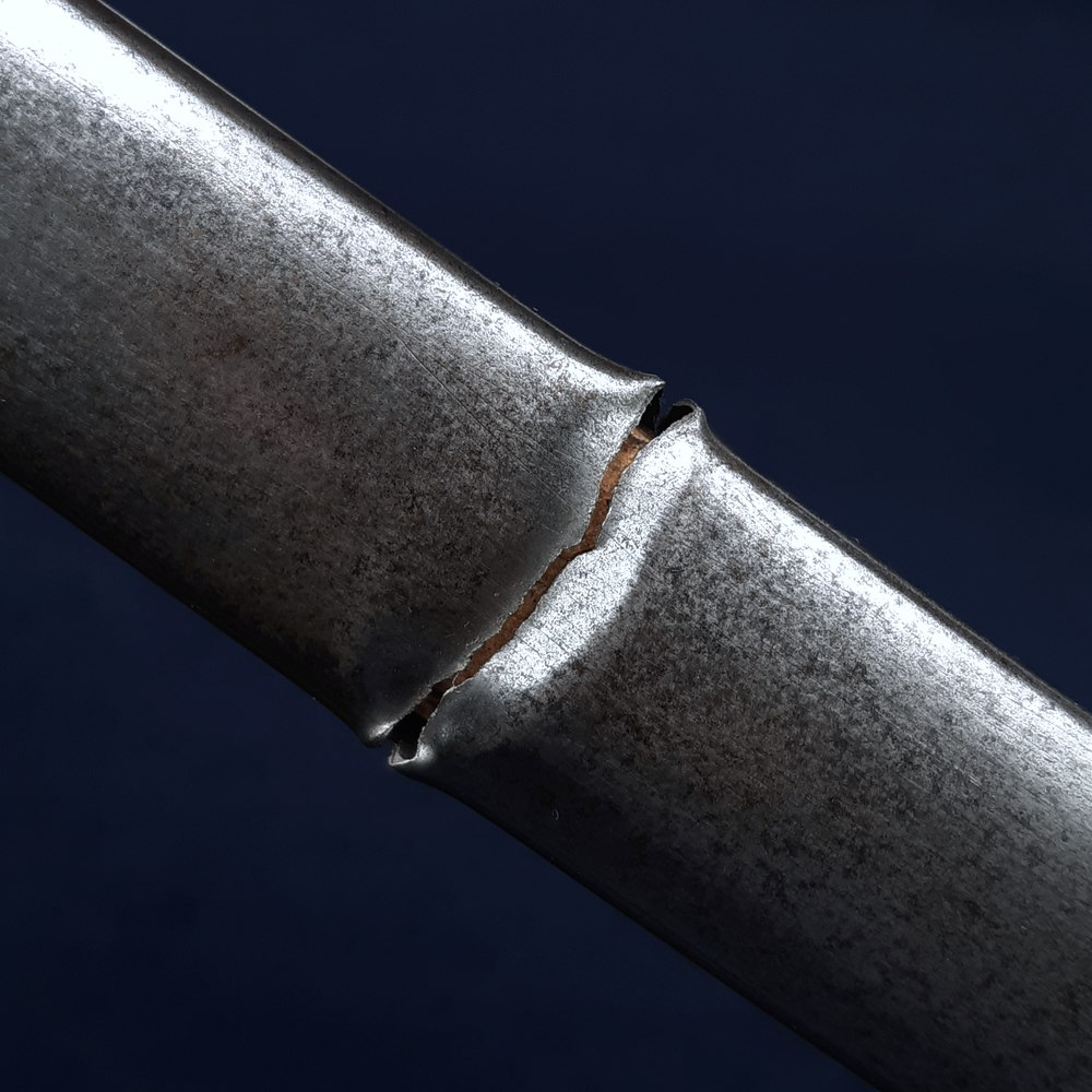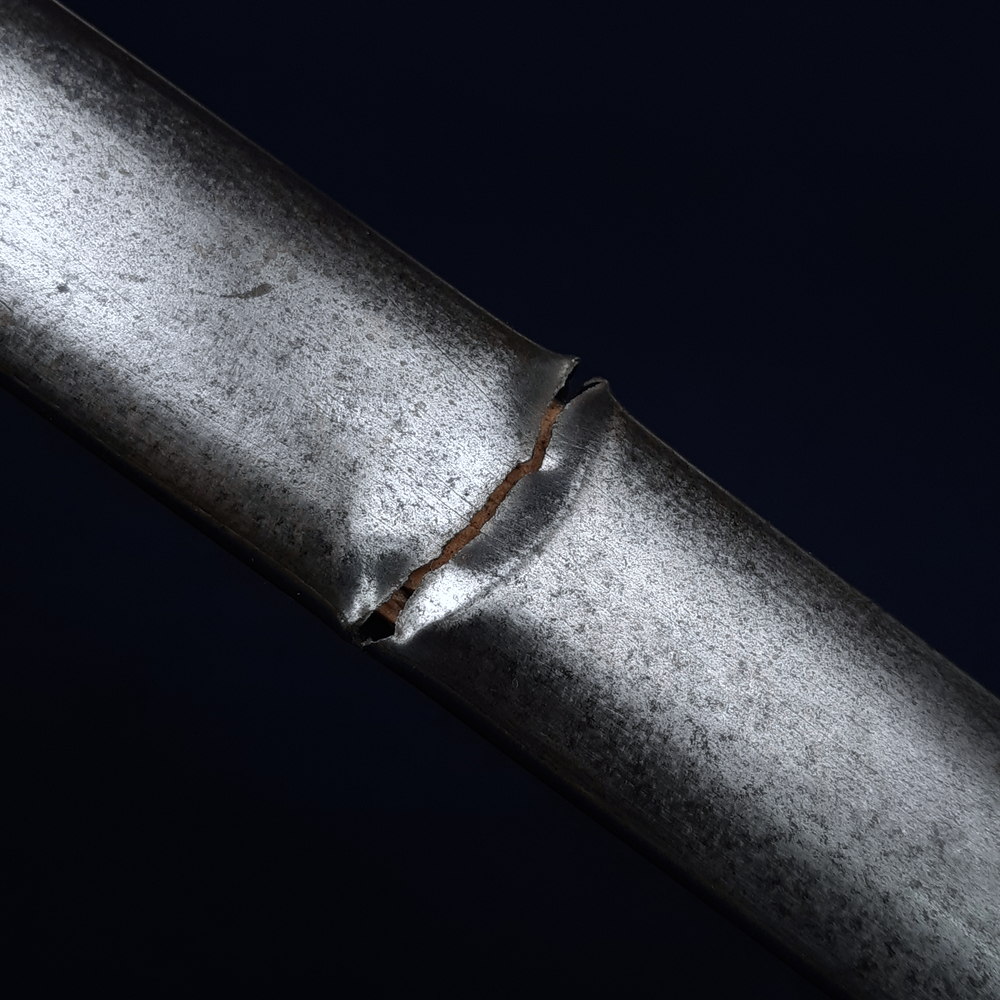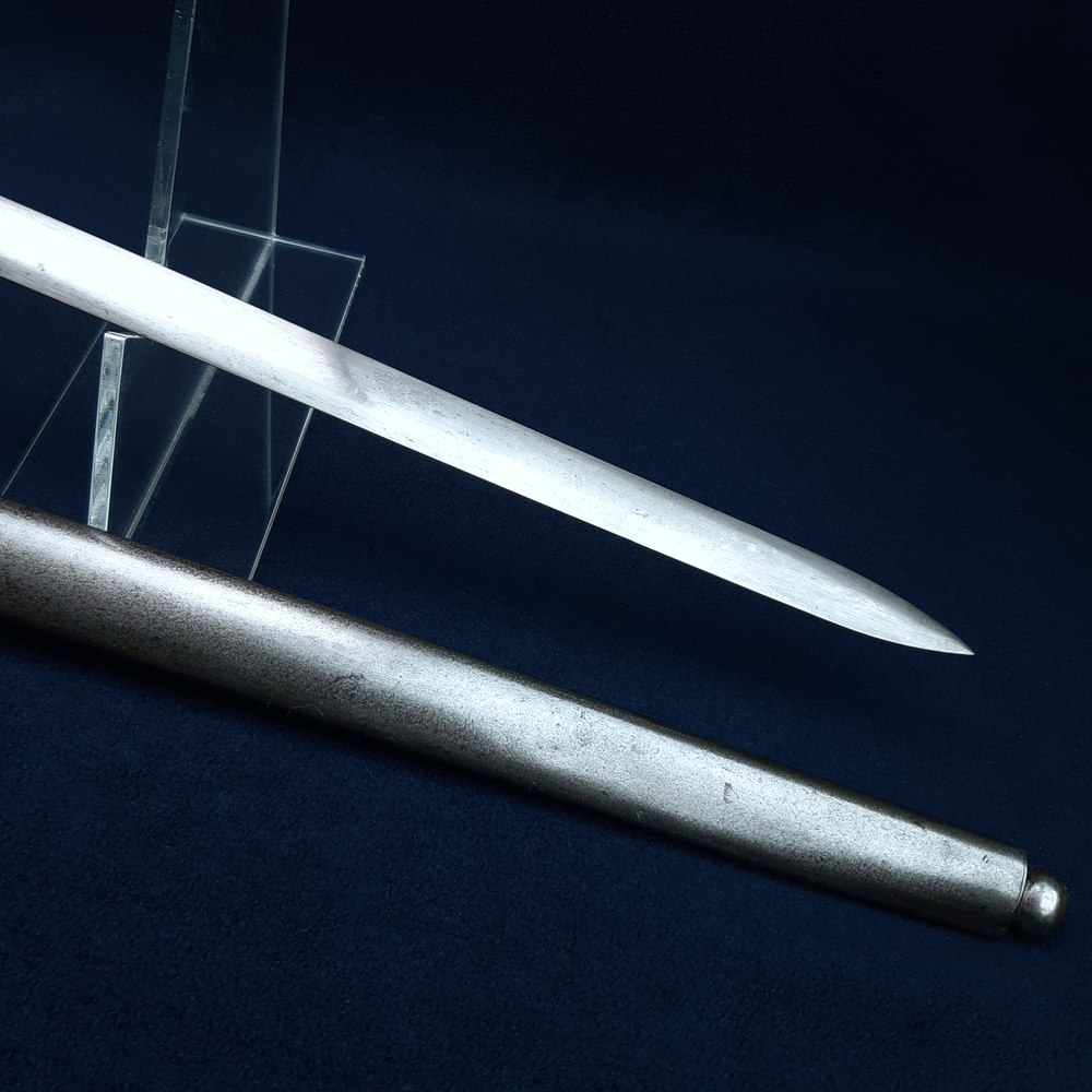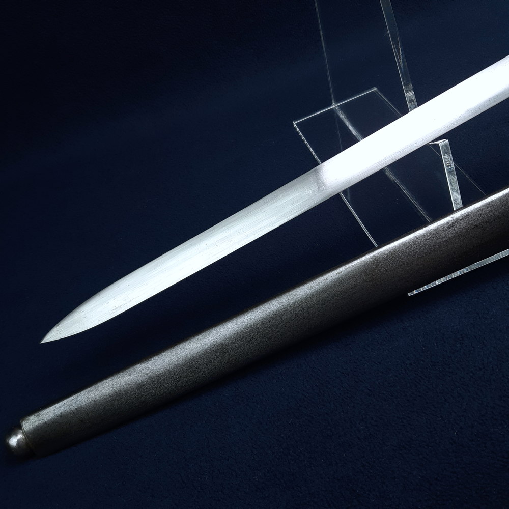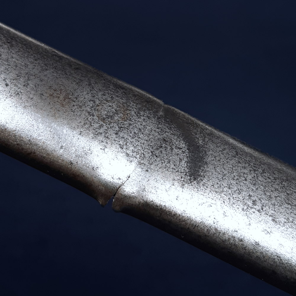 The scabbard has speckled light patination and one spot of notable damage – a deep dent on one side which has rent the steel, exposing the wood core and meaning that the scabbard is supported there only by the remaining strip of steel on the opposite side, which flexes due to the weight of the scabbard. Too much bending there could put pressure on the wood core, so take care to support the scabbard when the blade is withdrawn. One small dent elsewhere on the opposite side. Despite this damage the sword still fully sheaths and draws.