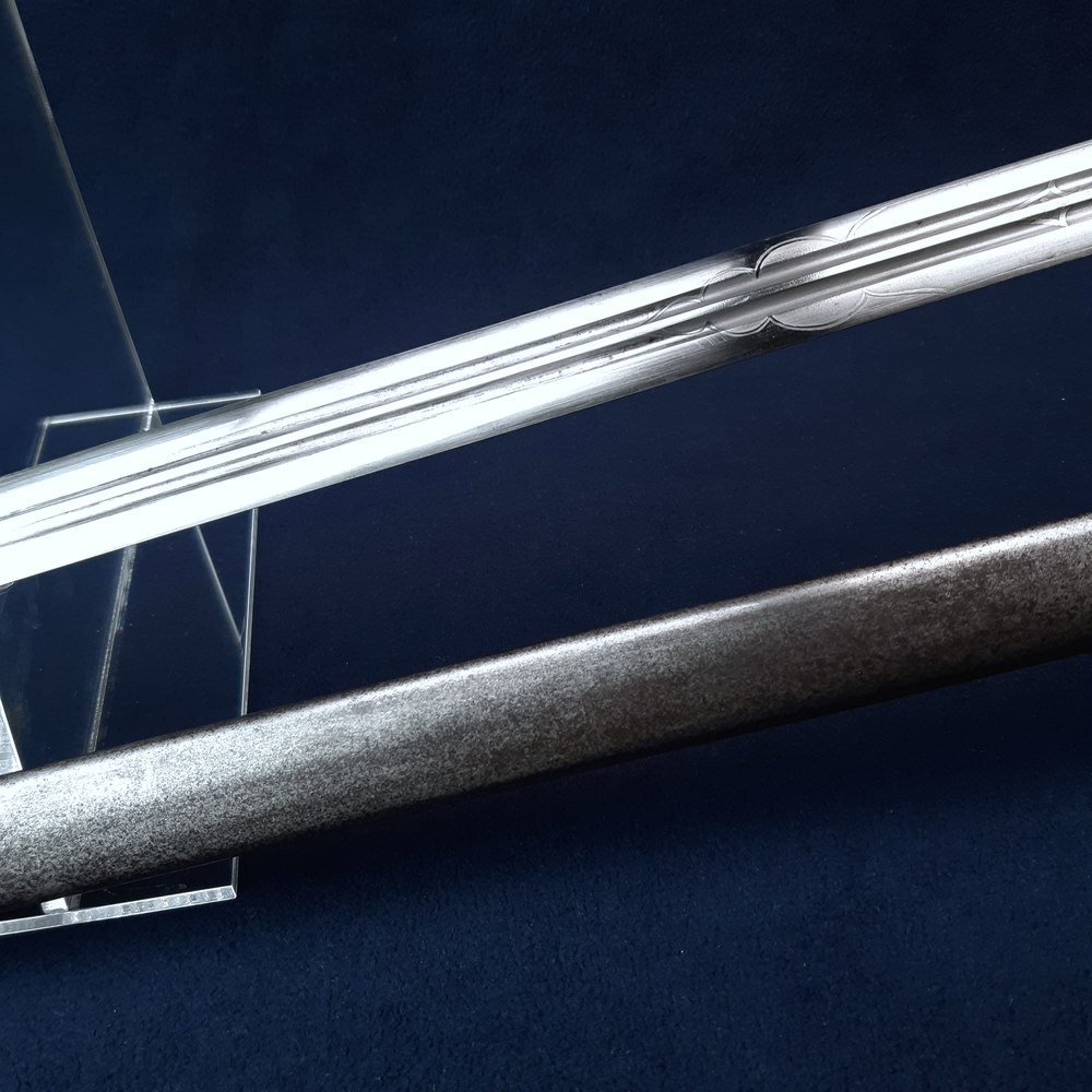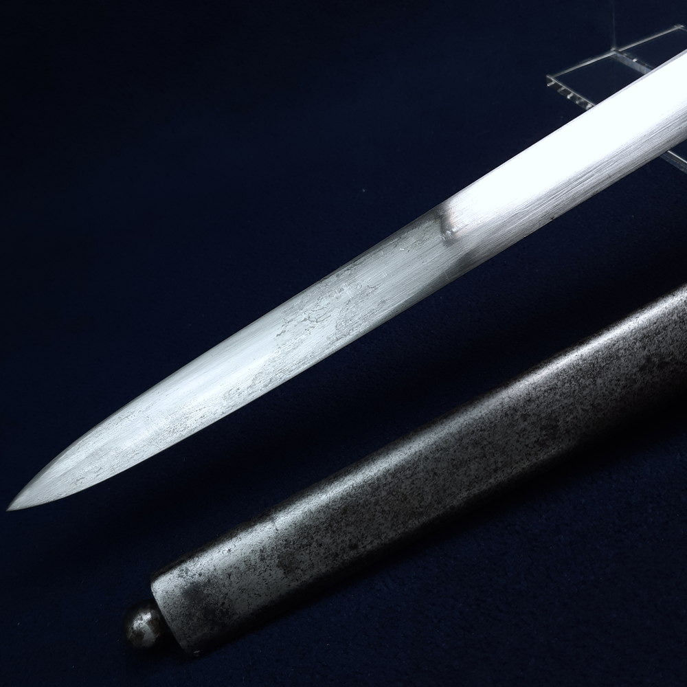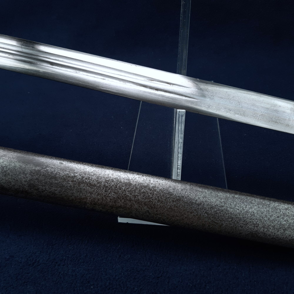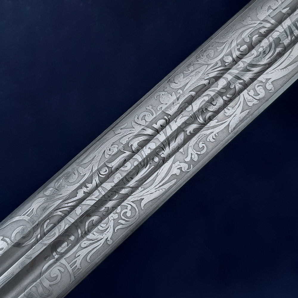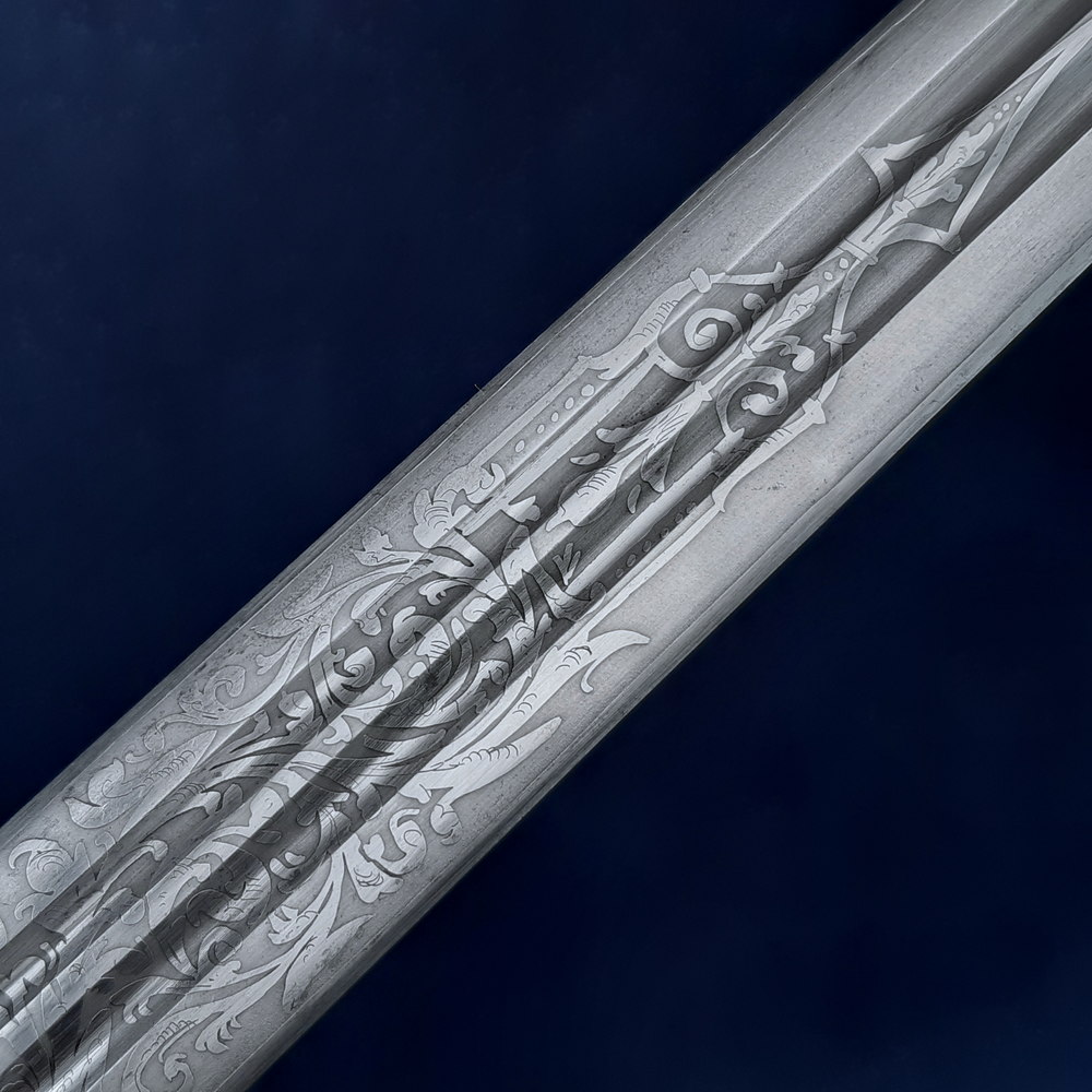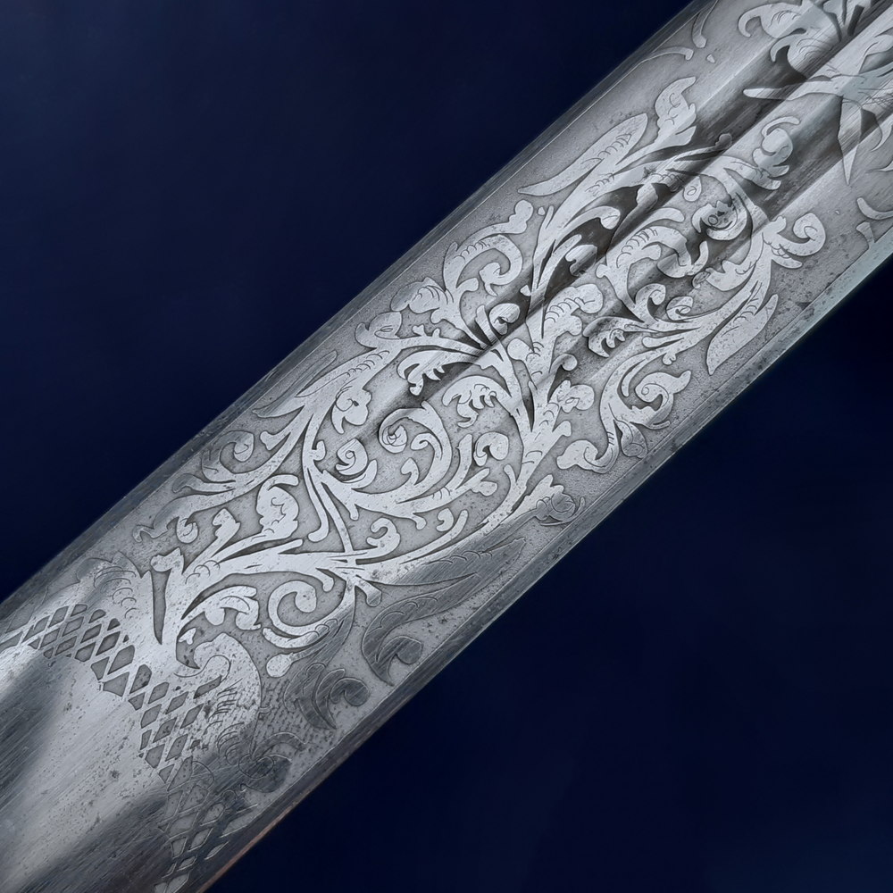 The blade’s finish is excellent with only a handful of tiny spots of patination, some very light scattered scratches towards the tip. The etching is bright and clear, retaining the contrast between the matt acid-etched background and the reflective polished designs within it. The blade’s edge is unsharpened and undamaged. The shagreen of the grip is all intact with very light handling wear, its wire binding is all present with slight movement to the loops nearest the pommel. The, hilt, ferrule and pommel have speckled cleaned pitting.