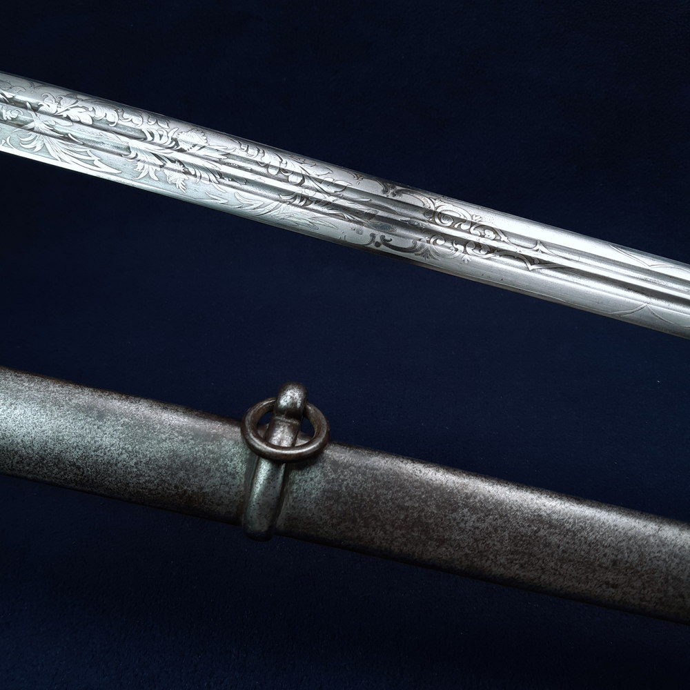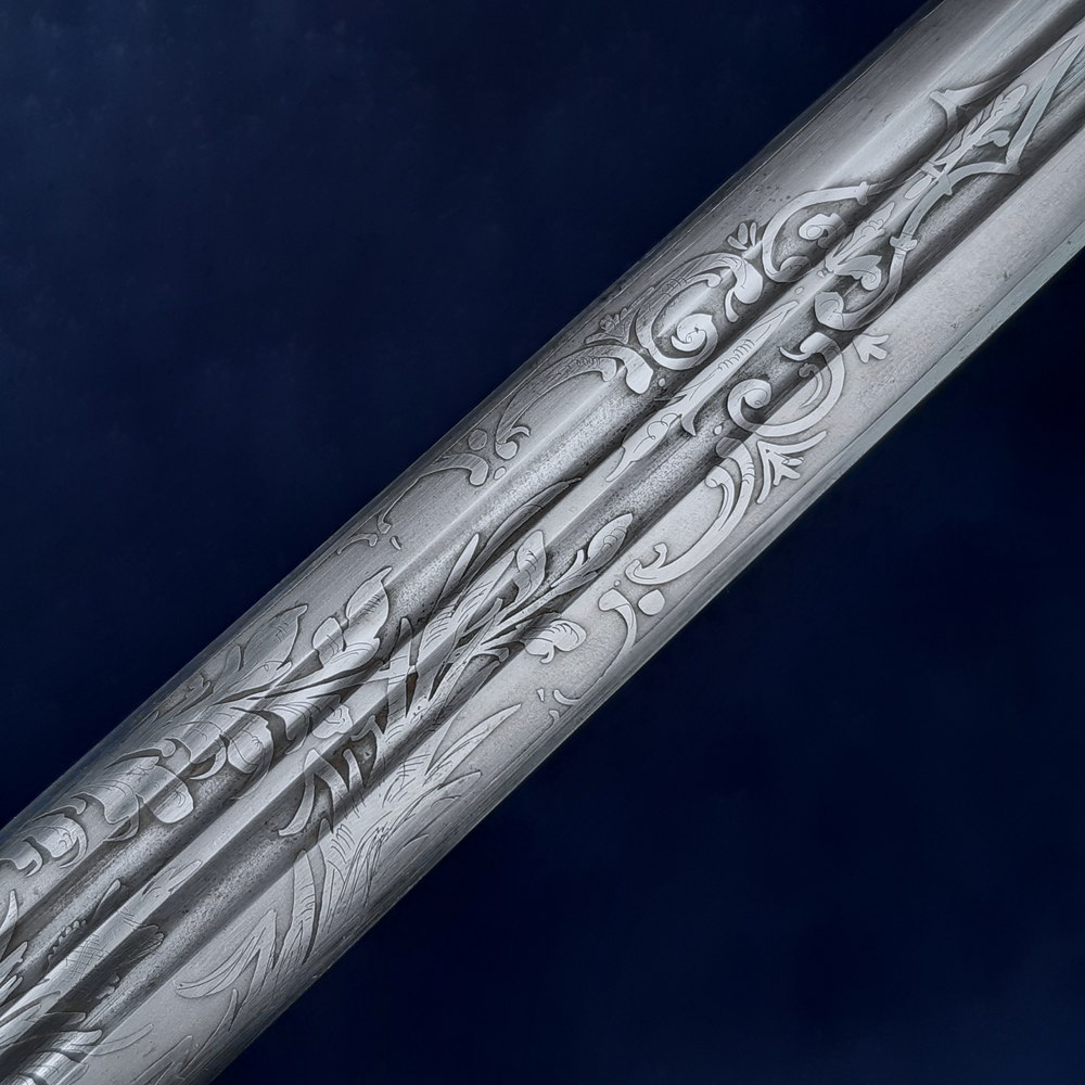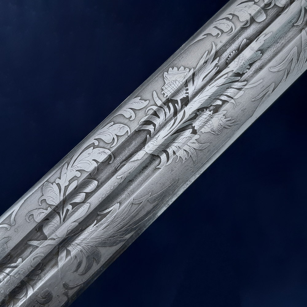 The blade is etched with foliate motifs incorporating thistles, laurel and palm, the crown and cypher of Queen Victoria, an on one side at the ricasso with the retailer’s mark ‘Furnished by MIDDLEMASS 18 South Bridge EDINBURGH’ beneath the Prince of Wales’s badge of a crown and three feathers and ‘BY APPOINTMENT’. At the ricasso on the other side is a brass proof slug reading ‘PROVED’ set within an etched six-pointed star.