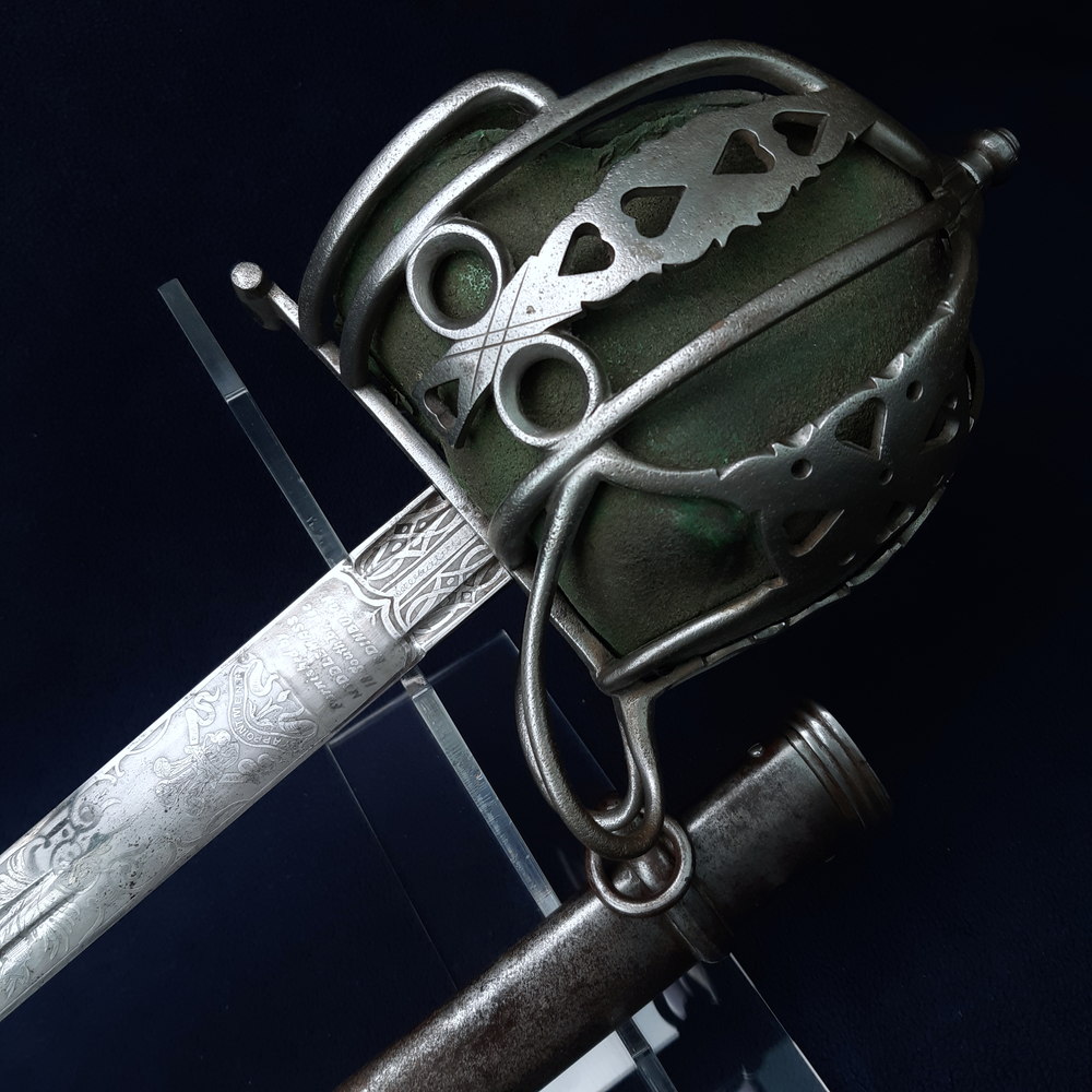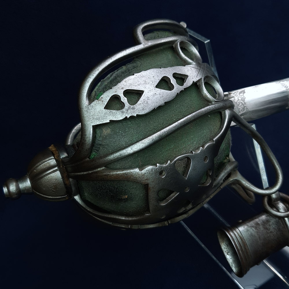 Straight spear-pointed blade with double central fullers and two short fullers at the ricasso. Steel pierced basket hilt, unusual green leather hilt liner. Spiral grip of wood covered with shagreen bound with wire, steel ferrule and pommel cap. Steel scabbard with two hanging rings, ball finial at the chape. 32½ inch blade, 38½ inches overall.