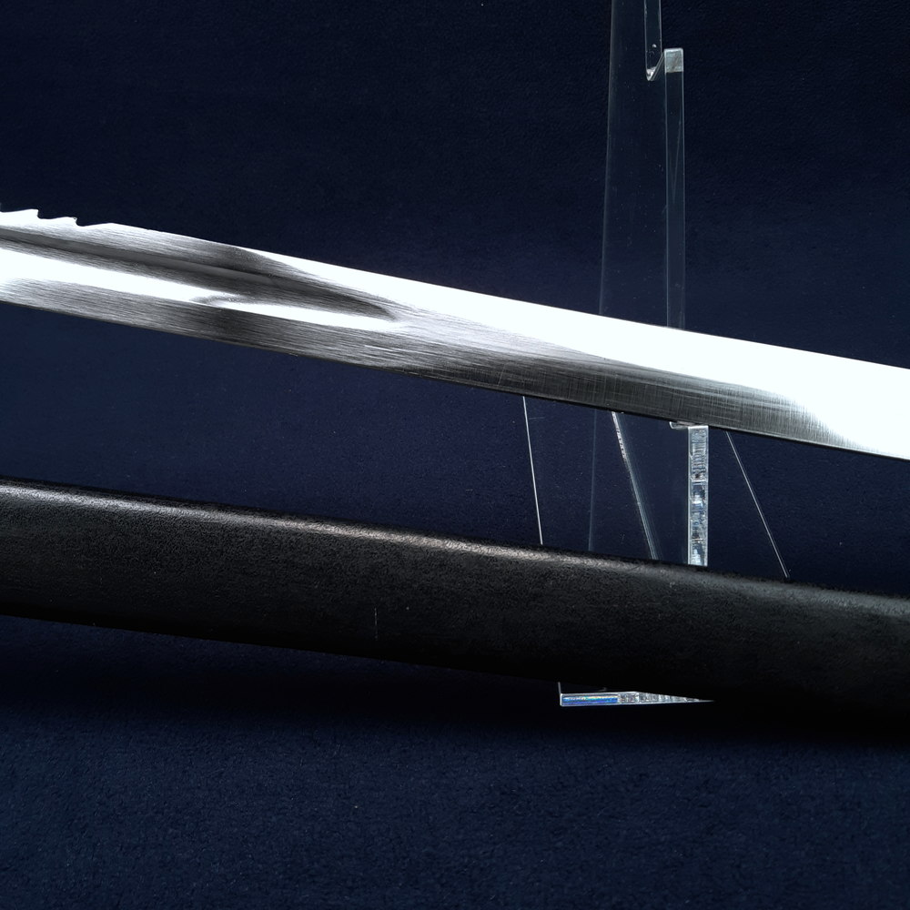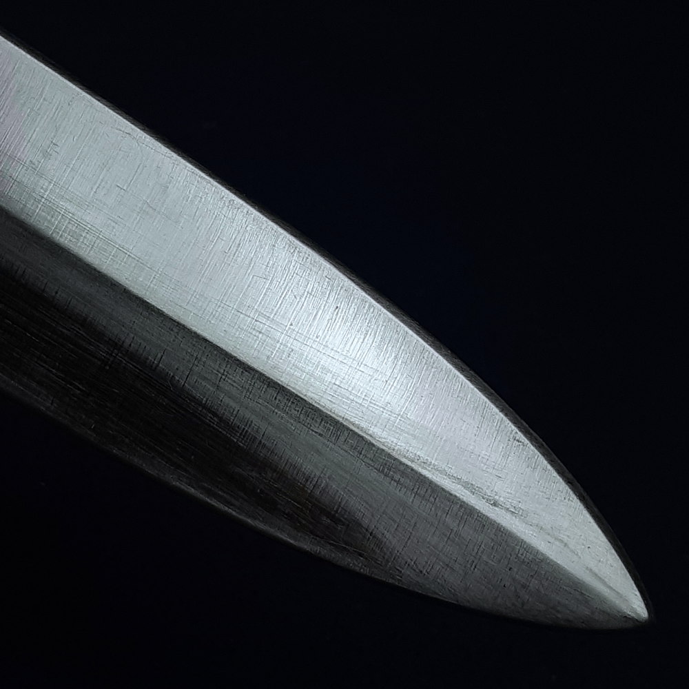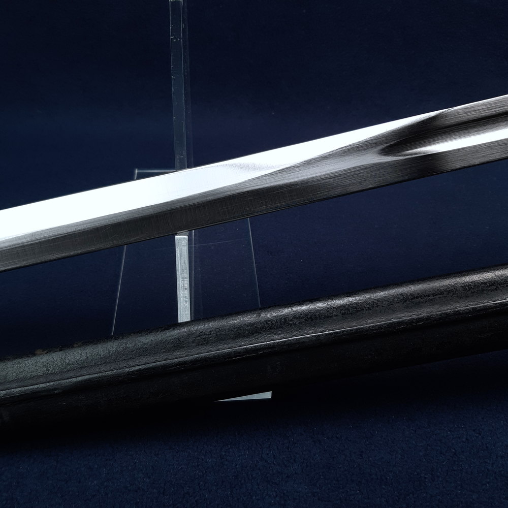 One fold has occurred in the scabbard leather just above the chape piece, which has resulted in a crease on the front face and a crack to the leather on the rear face which opens slightly with the weight of the chape piece. This does not interfere with sheathing and drawing. Take care to support the scabbard when the blade is unsheathed to prevent the crack opening and propagating.