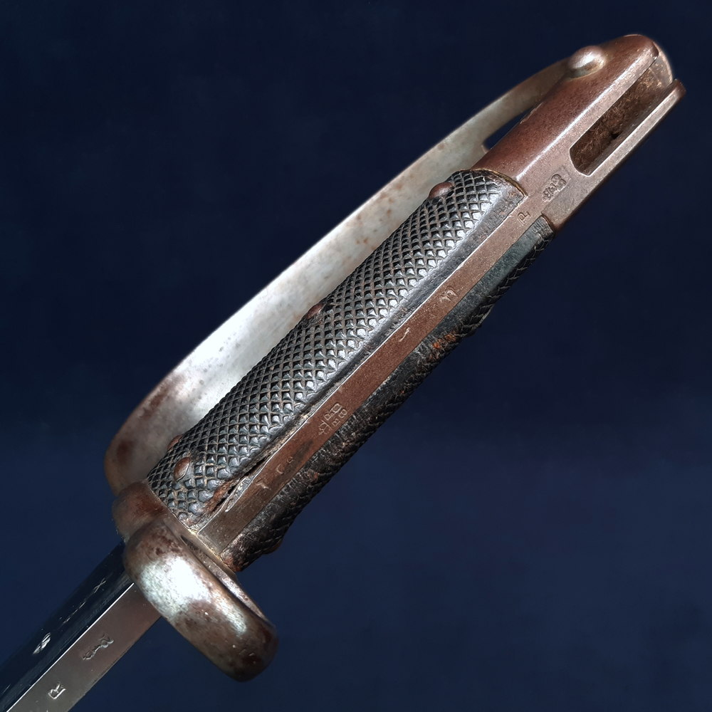 The blade is profusely stamped on one side of the ricasso with a crown over ‘V.R.’ (Victoria Regina), a Birmingham repair/refurbishment mark of a crown over ‘BR’ over ‘66’, seven crown inspection marks with ‘E’ indicating the Royal Small Arms Factory at Enfield, and reissue dates ’96. ’97, ’99, ’01, ’02, ’03, ’04, ’05, ‘06 for 1896 etc.