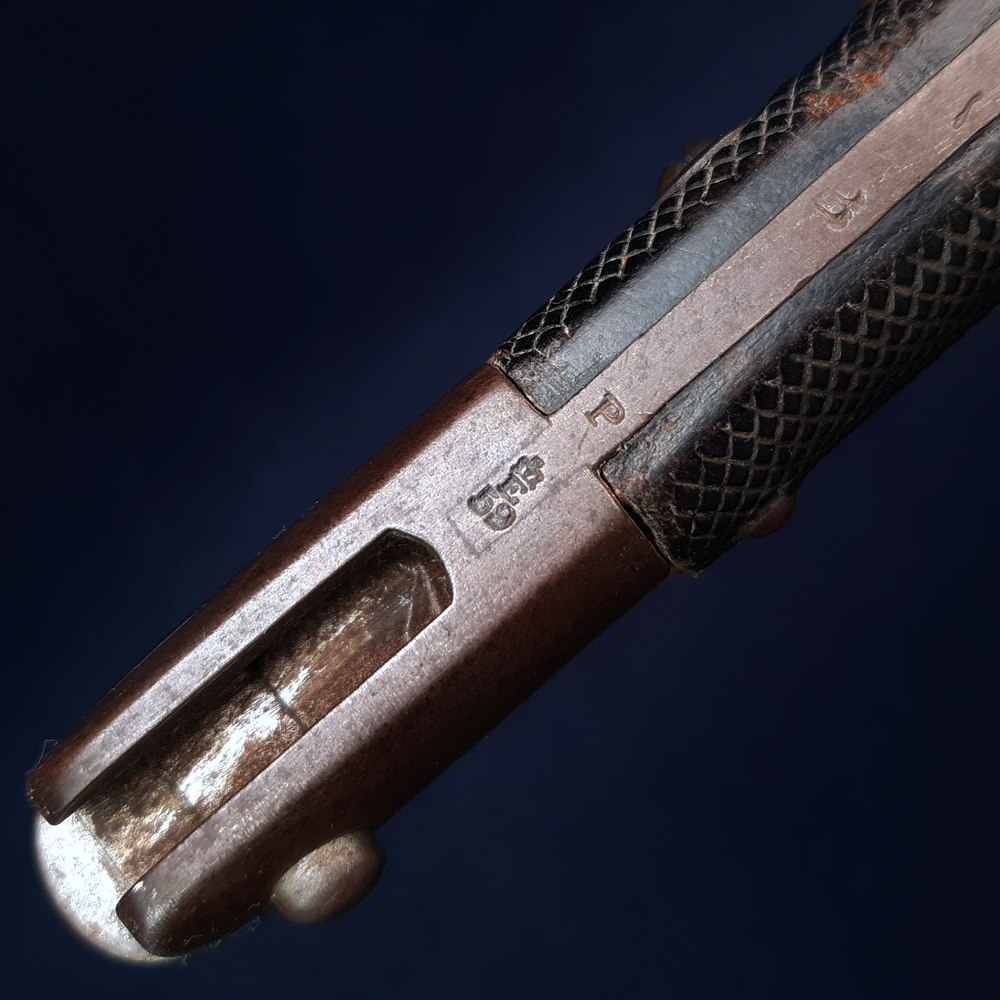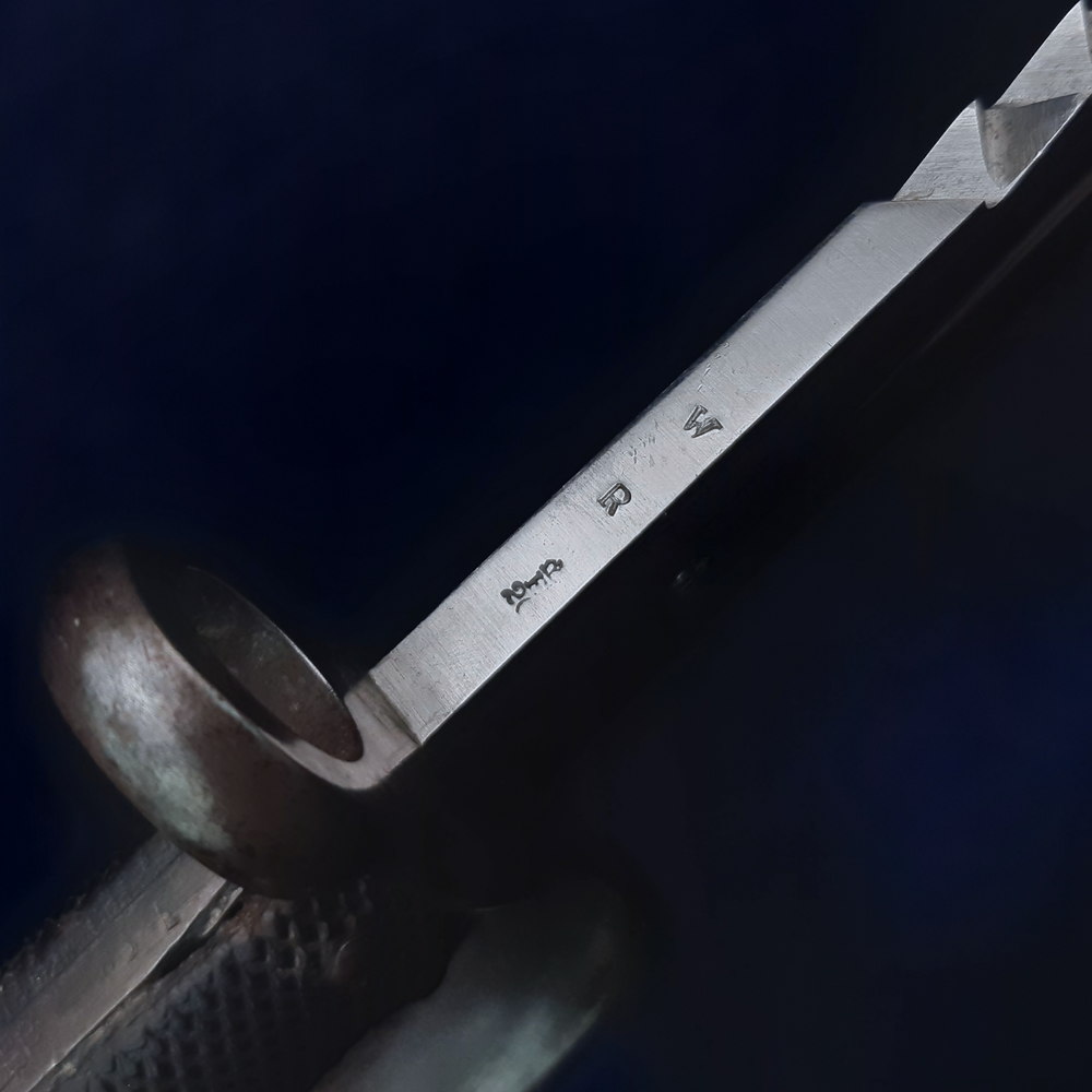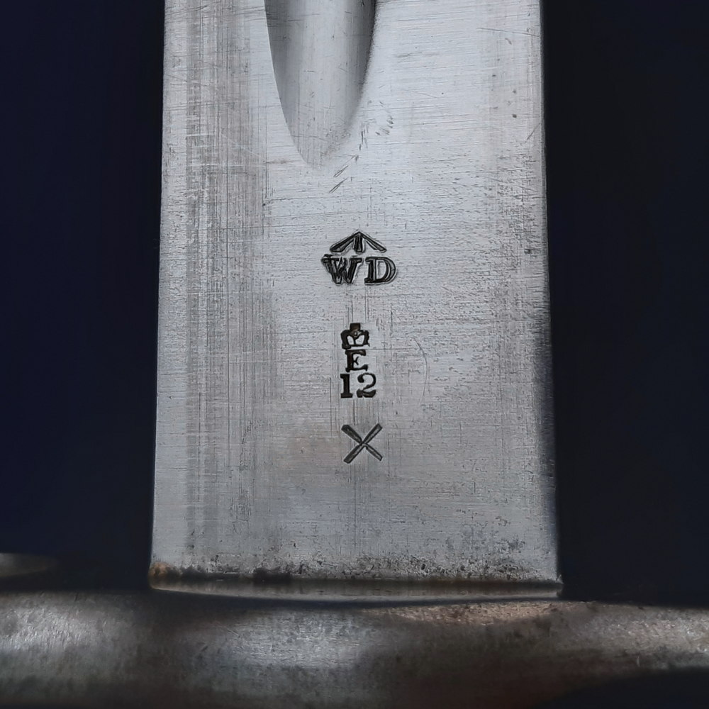On the other side it is stamped with a broad arrow atop ‘WD’, meaning War Department property, another crown inspection mark with ‘E’ and an ‘X’ which indicates that the blade passed a manufacturer’s bending test. The spine of the blade has another Enfield stamp, a ‘W’ and an ‘R’. The exposed tang has another Birmingham repair stamp, ‘1’, ‘08’, ‘B’ and ‘P’. The pommel is stamped near the mortise slot with another Enfield crown inspection mark, and near the locking button with serial or rack numbers ’33’ (this later cancelled with strikethroughs) and ‘15’.