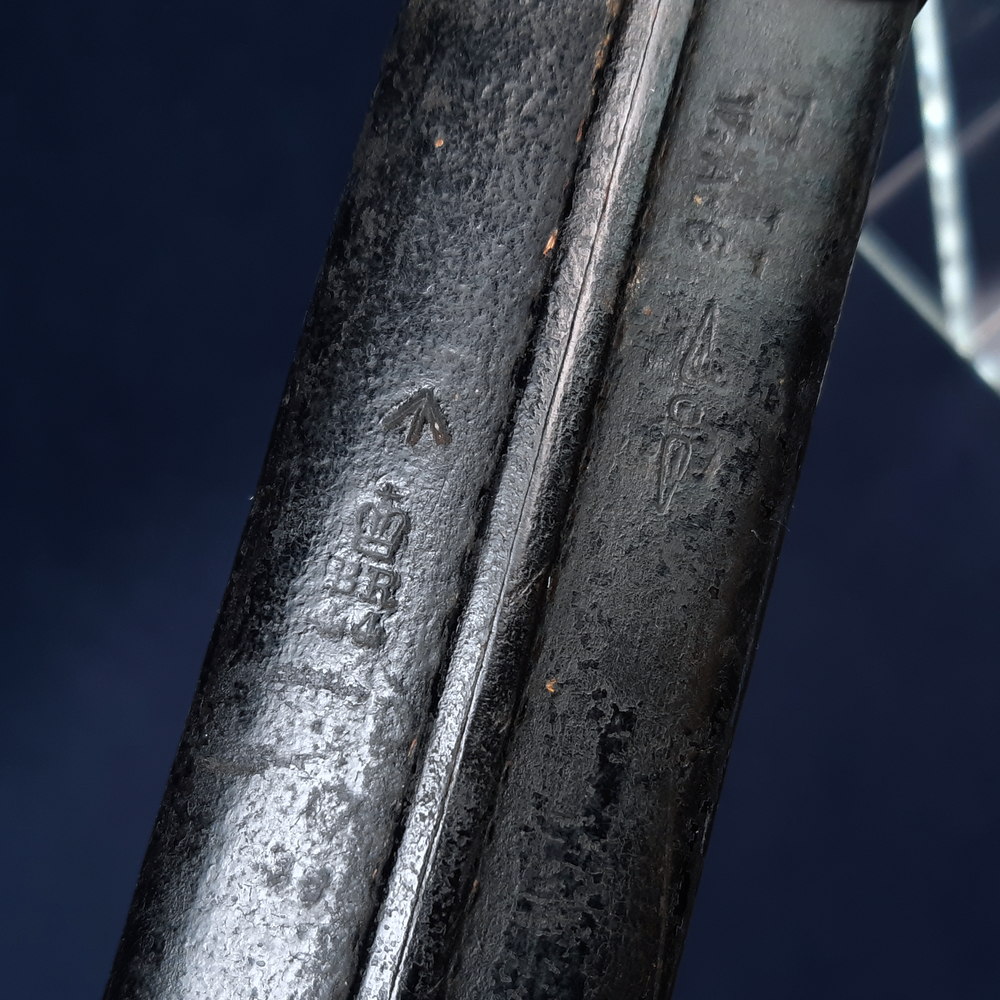 The leather of the scabbard is stamped next to the seam with a broad arrow, another Birmingham repair mark with ‘BR’ over ‘44’ and another faint crown inspection mark. On the other side it is stamped with ‘W.A.C.’, the ‘C’ double stamped, and another mark which has been cancelled with an ornate strikethrough (a circle and two teardrop shapes).