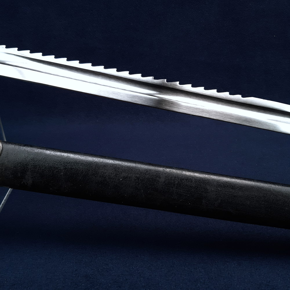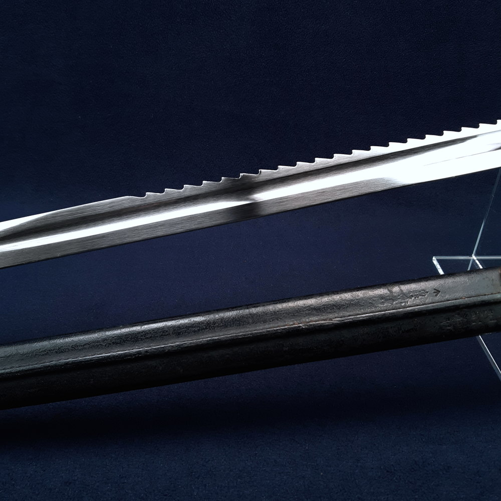 The blade has a bright polished finish with only a few tiny spots of patination. The tip of the blade has been sharpened and may have been reshaped, noting that the blade is about ¼ inches shorter than standard. The sawblade is excellent, with no broken teeth and only the uppermost tooth having any significant tip wear. The leather grips have very little handling wear, a few chips and abrasions to the edges of the scales where they contact the exposed tang. The hilt and steel pieces of the scabbard have a lightly patinated finish overall with some spots of darker patination. The exposed tang and pommel have even moderate patination. The chape piece of the scabbard has some small dents.