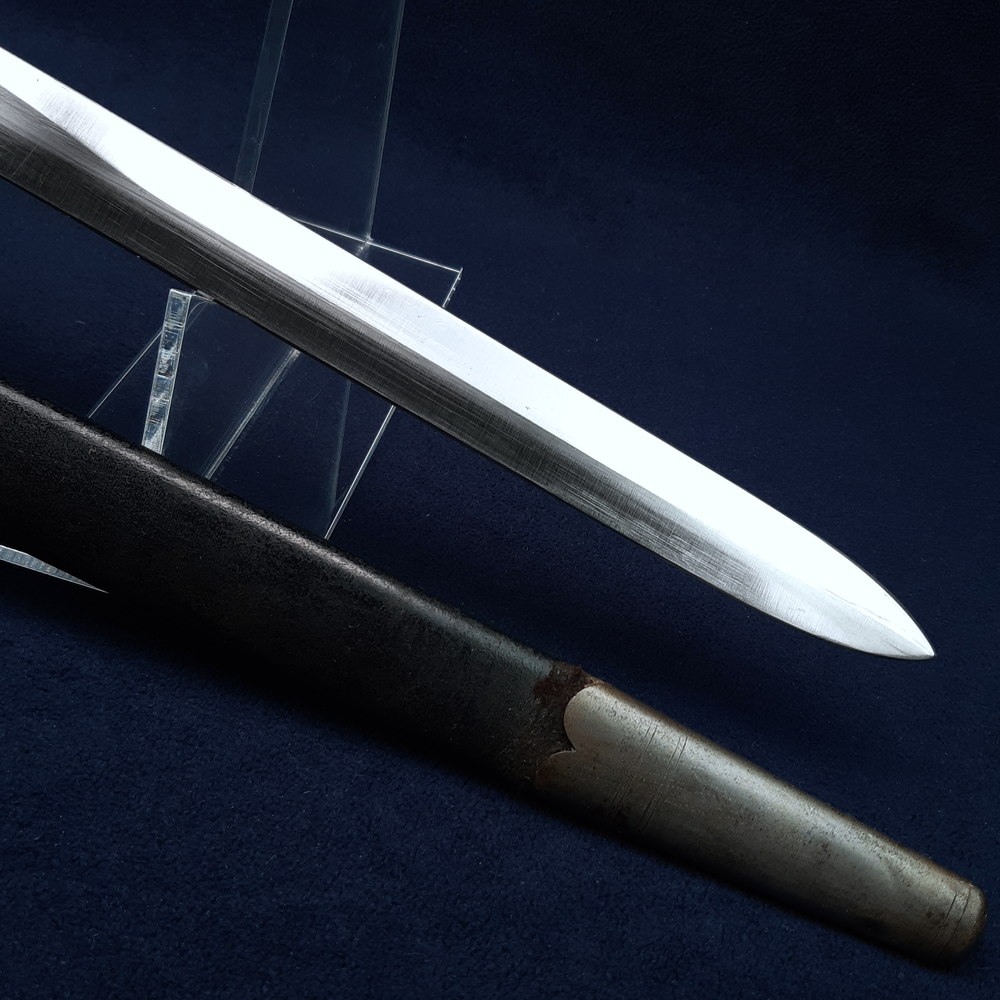 Straight single-fullered blade with sawback, steel knucklebow hilt with slit for sword knot and muzzle ring. Black pressed leather grips with chequering (technically, knurling), steel pommel with external leaf spring. Black leather scabbard with steel chape and throat with teardrop frog stud. Blade 25 3/4 inches in length, the bayonet 31 1/4 inches overall, muzzle ring 0.65 inches in diameter (1.65cm).