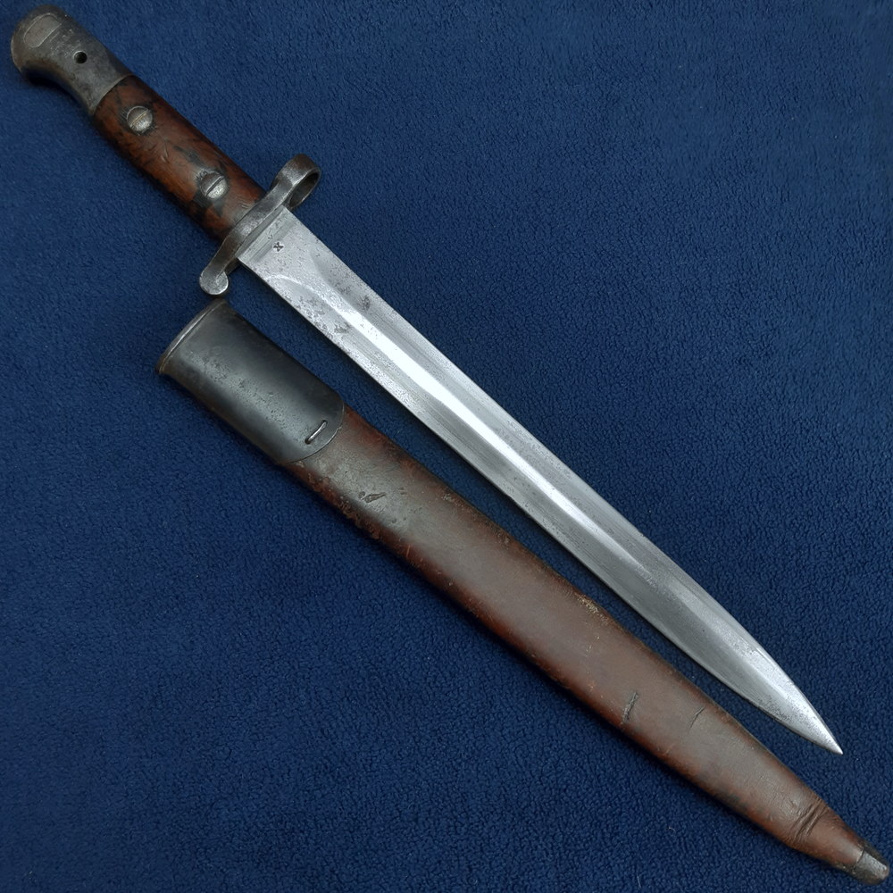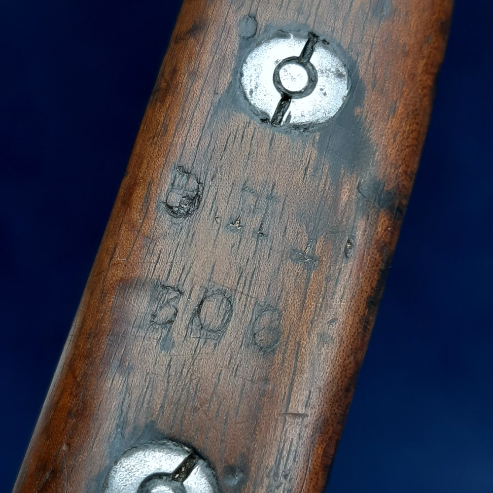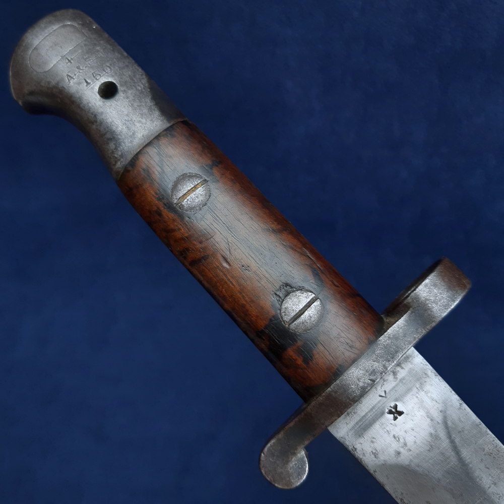 The manufacture date predating 1903 indicates that this is one of the 1903 bayonets produced at Enfield by converting previous patterns which used the same blade, in this case the 1888 Mk II bayonet. Its original maker’s mark has been removed due to refinishing and remarking of the blade in this process, while part of the original bending test ‘X’ mark can still be seen next to the new one. Its Mk II Land Pattern scabbard, originally for the 1881 Pattern bayonet, could also be reused as it was fully compatible with the 1903 Pattern.