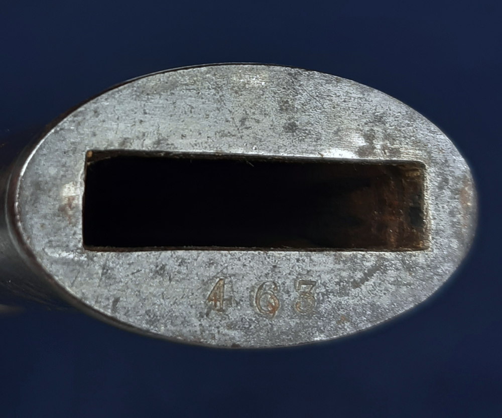 The pommel is stamped with ‘4’ over ‘A.&.S.H.’ over ‘150’. This indicates that this was bayonet number 150 used by the 4th Battalion, The Argyll & Sutherland Highlanders. This has been cancelled with strikethroughs.