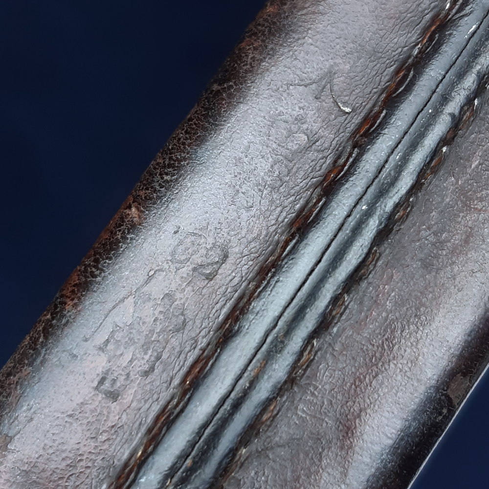 The exposed tang is stamped with ‘T’. The wood grips are stamped on one side with another unit mark of ‘DHY’ over ‘300’, indicating the Denbighshire Hussars Yeomanry. The base of the pommel is stamped ‘EFD’ indicating manufacture at the Royal Small Arms Factory at Enfield. The throat piece of the scabbard is stamped at the mouth with ‘463’. The leather of the scabbard is stamped next to the seam with another broad arrow, two crown inspection stamps for Enfield and the manufacture date ’02.