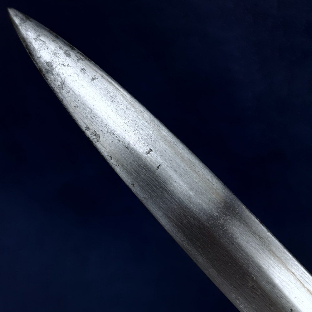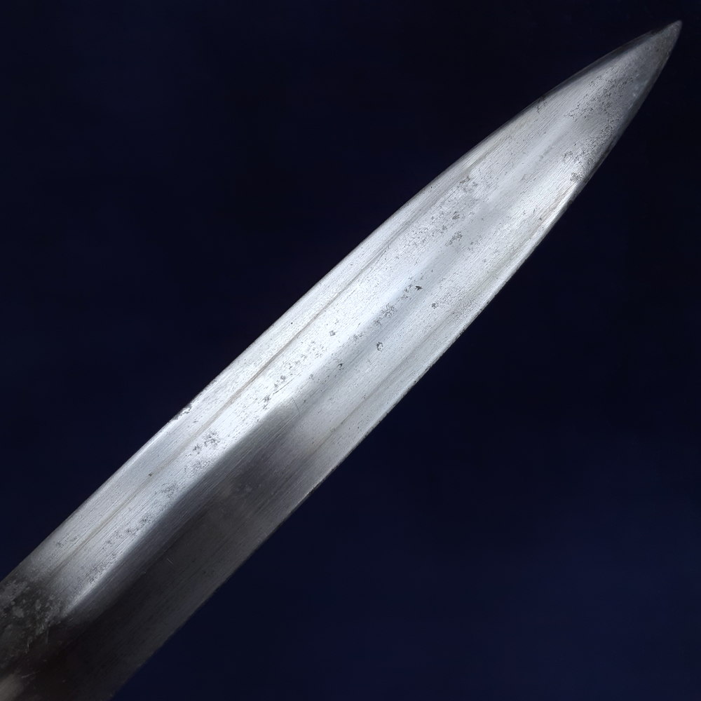 The blade is bright with patches of cleaned pitting at the forte and near the tip, and polishing marks overall with no edge damage. The ricasso of the blade retains its original band of bluing, slightly rubbed. The hilt, exposed tang and pommel also have a blued finish, with some wear revealing lightly patinated steel. The scabbard throat piece is likewise blued bright with spots of patination. The wood grips have light handling wear, a few small dents and areas of staining. The scabbard leather has some dents and rubbing wear, all of its stitching is intact. The chape end of the scabbard is slightly kinked (common on this type), but this does not interfere with sheathing and drawing.