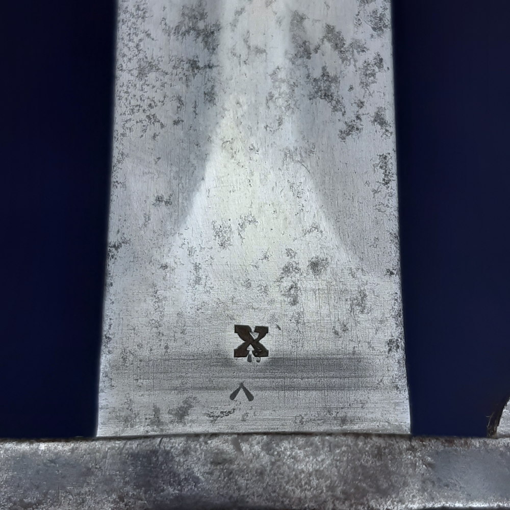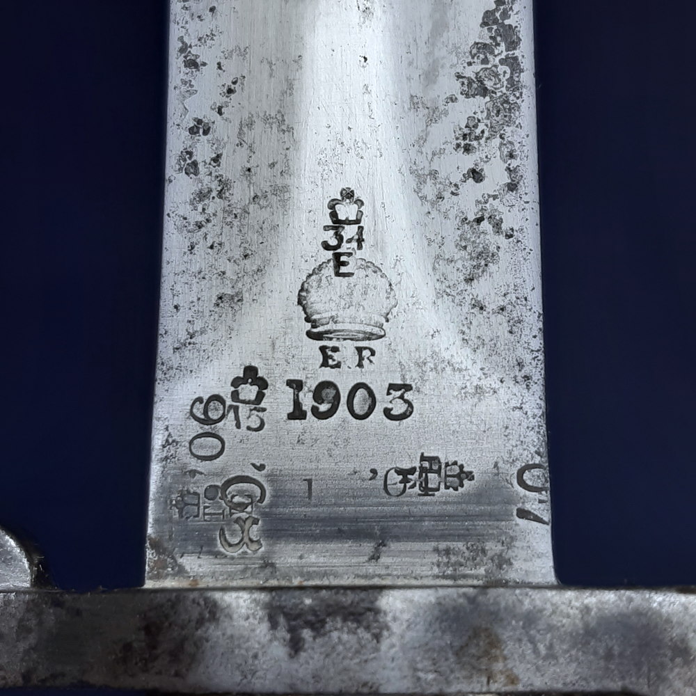 The blade is stamped on one side of the ricasso with a crowned ‘E.R.’, and 1903 (the pattern), a production date of 1 ’01, meaning January 1901, three crown inspection marks with ‘E’ for Enfield and reissue stamps ’06, ‘07 and ’08. On the other side it is stamped with an ‘X’ which indicates that the blade passed a manufacturer’s bending test, and what looks like a second ‘X’ mark below it. The belly of the blade is stamped with ‘7’.