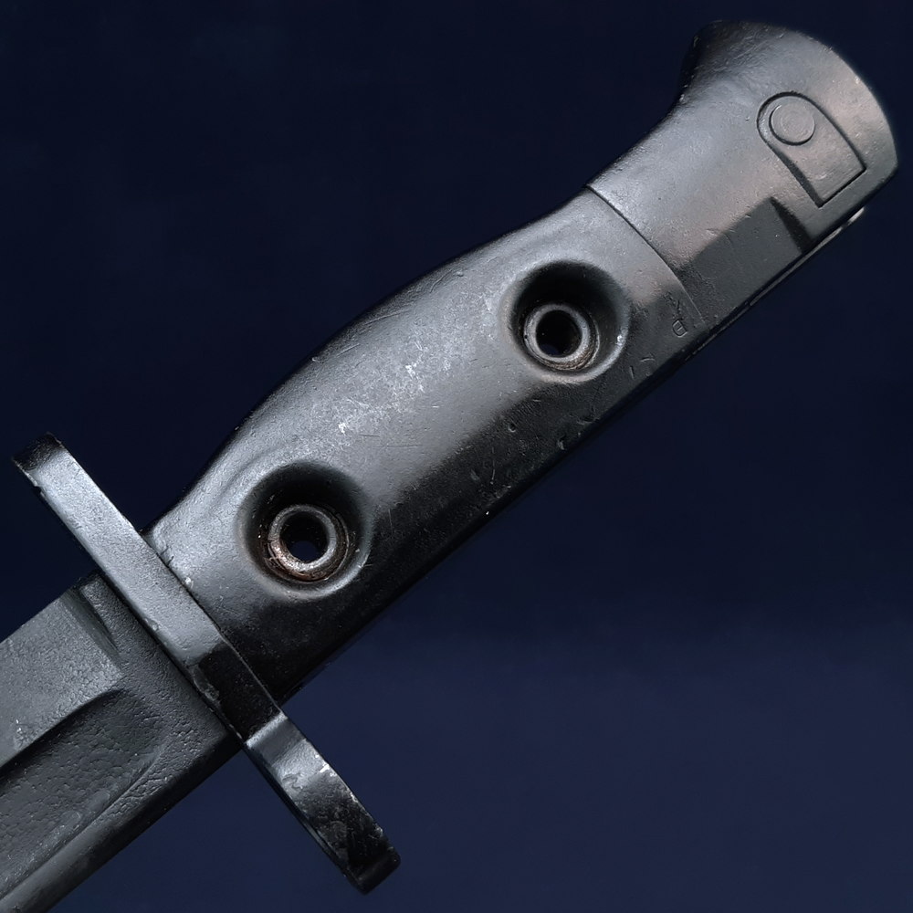 The grip slabs are each stamped with another ‘D’ with a stroke Enfield stamp and another broad arrow. The pommel is stamped on its base with the model ‘L1A3’, as well as with ‘0’ and ‘257’, the latter probably a serial or weapon number.