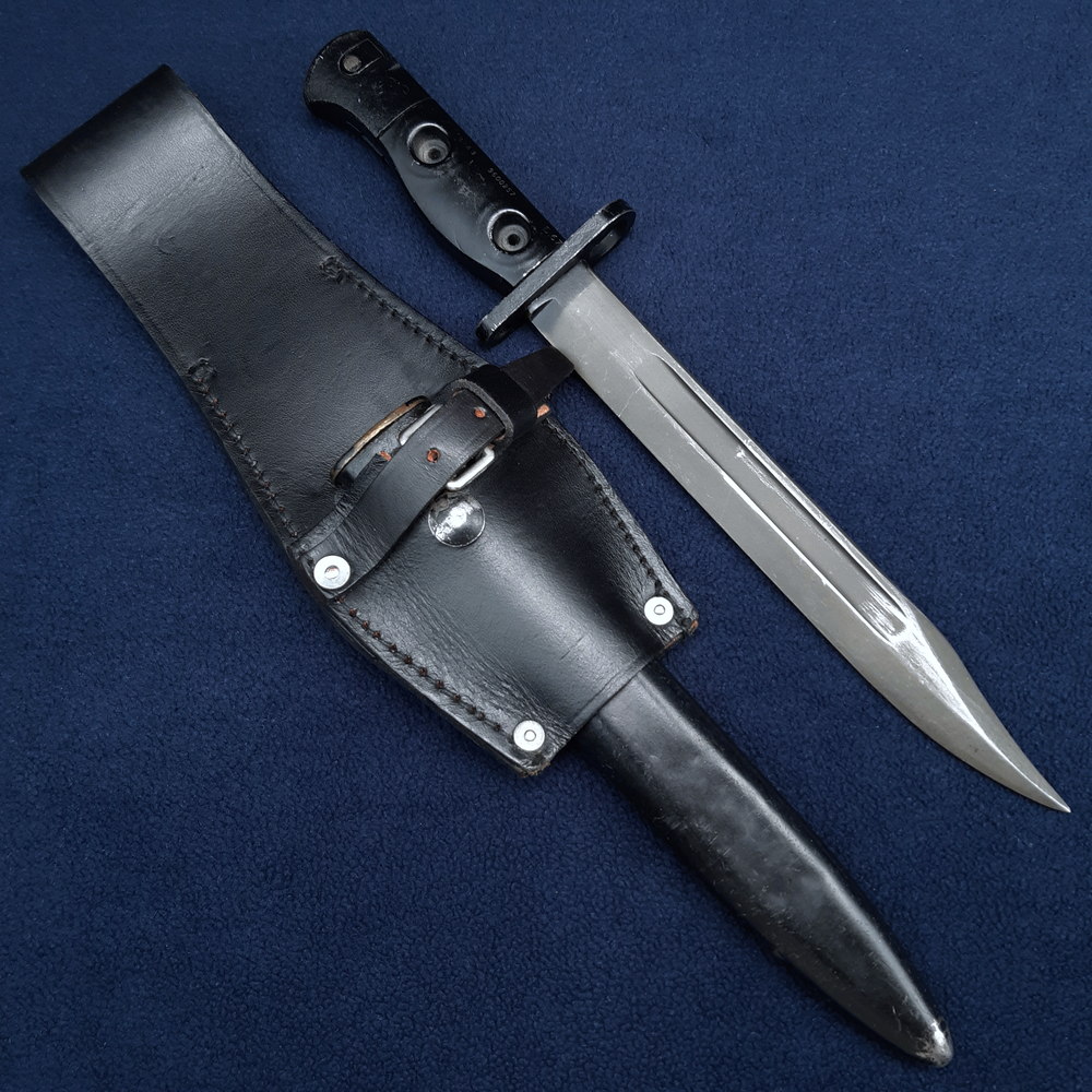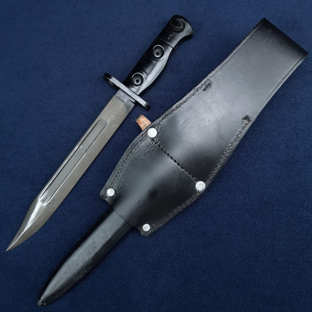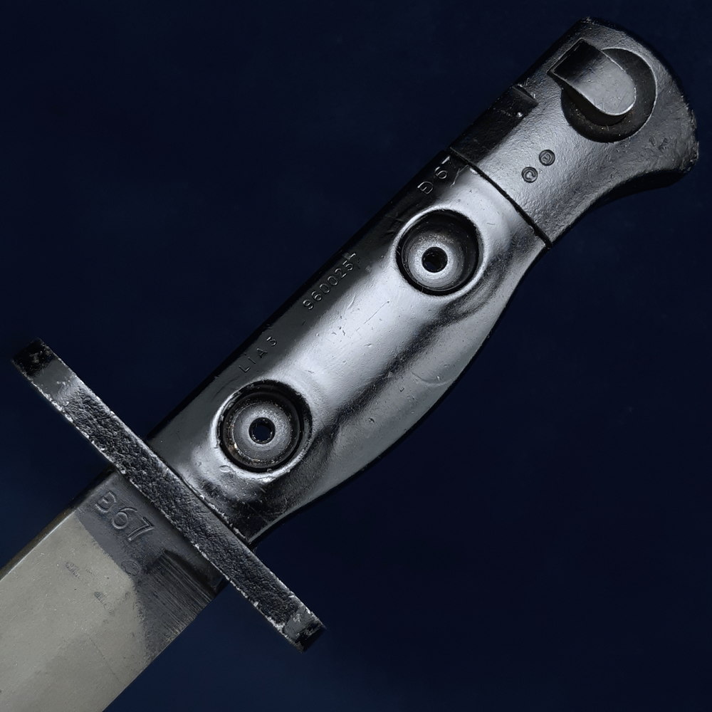 The L1A3 bayonet for the SLR rifle was sealed as a pattern in 1958, some made by converting the earlier L1A1 and some newly manufactured. This new example has a notably long ricasso, a feature introduced in the mid-1960s intended to strengthen the blade.