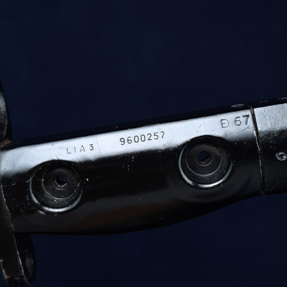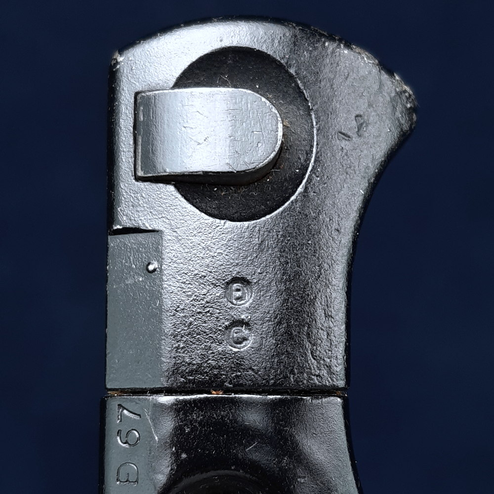 The pommel is stamped with ‘C’ and ‘D’ within circles on one side. The grips are both stamped with ‘L1A3 9600257 D66’, the other identical but with ‘D67’. L1A3 is the model, 9600257 is its NATO stores number, the ‘D’ with a stroke extending from the vertical is a mark of the Royal Small Arms Factory at Enfield, while 67 is the date of manufacture.