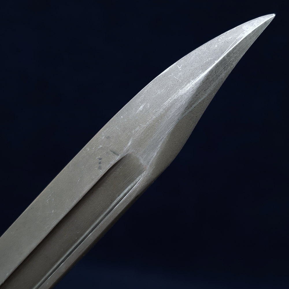 The blade retains its black parkerised finish with only tiny bright spots of wear on raised edges. Likewise some spots of wear to the paint on raised edges of the hilt, grips and pommel, a few very small chips to the scabbard’s paint with rubbing at its chape end exposing some bright steel.