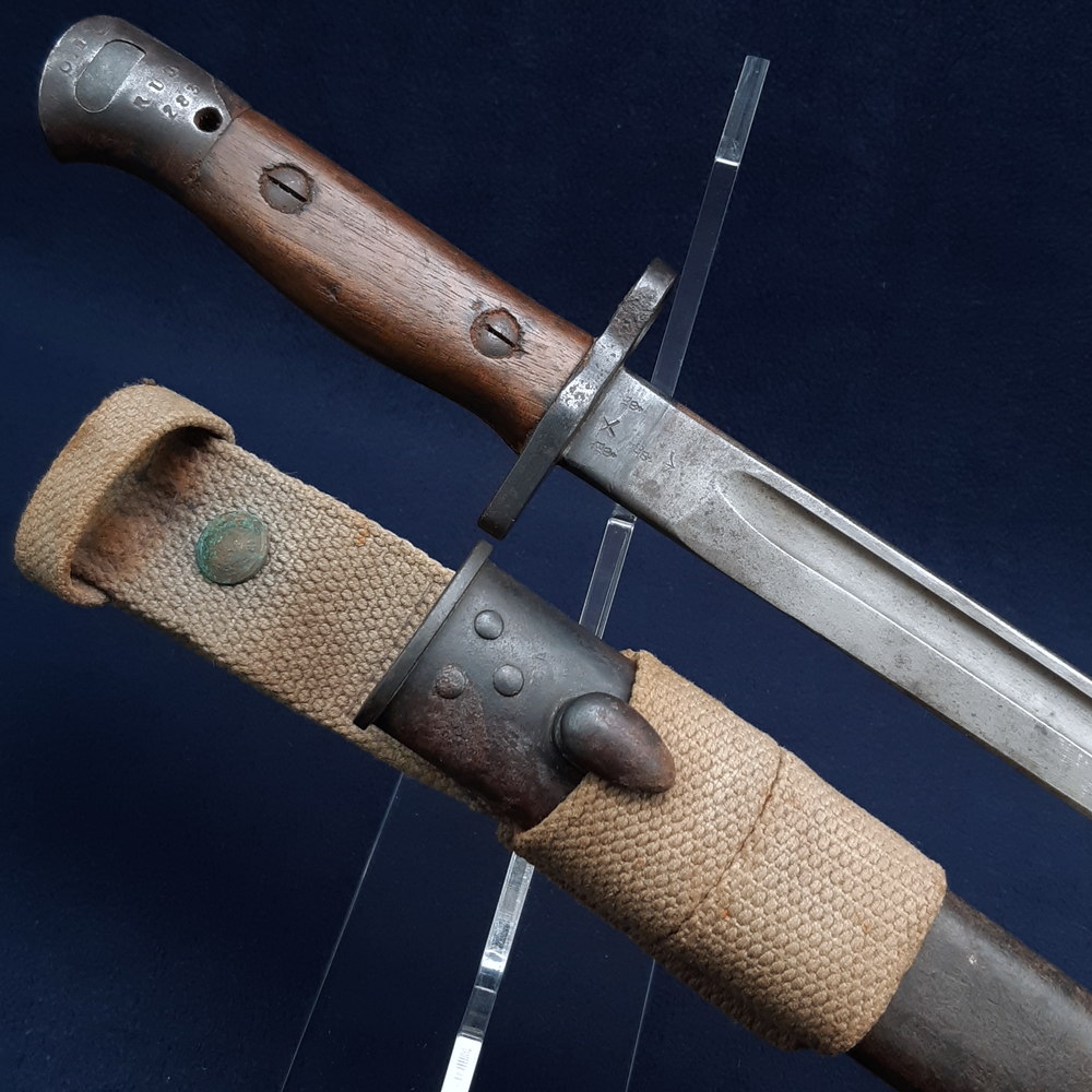 Because of its features this bayonet must postdate 1910, and was probably issued to replace the 1903 Pattern bayonets that were initially issued to school Corps. Its frog is quite a scarce pattern: the 1925 Pattern frog was issued to the RAF and in fact was not made in khaki until 1932 when the Canadian government appears to have ordered a number of them from the Mills Equipment Company. The 1937 Pattern generally replaced these so it may have been handed down as surplus and found its way to an OTC unit – as its reissue marks attest this bayonet was still in use as of 1939. The scabbard is not actually fully fitted into it – it arrived this way and I do not wish to force the stiff canvas too much to get the frog stud into it, although I think there is enough give.