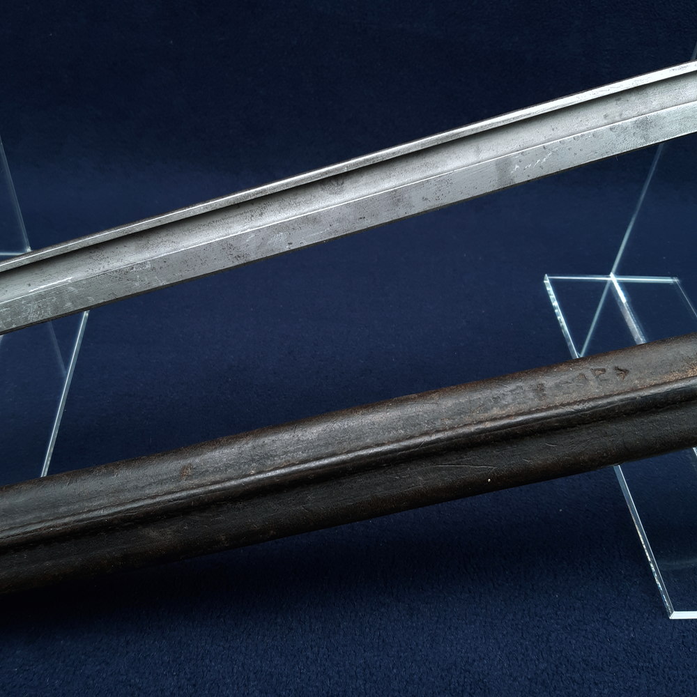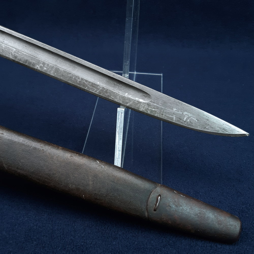 The blade has a matt parkerised finish with streaks of rubbing, some scratches and spots of light patination. Some small nicks to the sharpened edge near the tip, the tip rounded. The blued band at the shoulder of the blade is intact. The hilt, pommel and scabbard fittings are blued with some light rubbing on raised edges, but have also been impacted by rust leading to areas of moderate to heavy pitting and encrustation, the latter most notable on the throat piece of the scabbard. While this is removable by polishing, that would also remove the remaining blueing. Only a few small dents to the wood grips. The leather scabbard body has some light dents and surface abrasion. All the scabbard’s stitching remains intact.