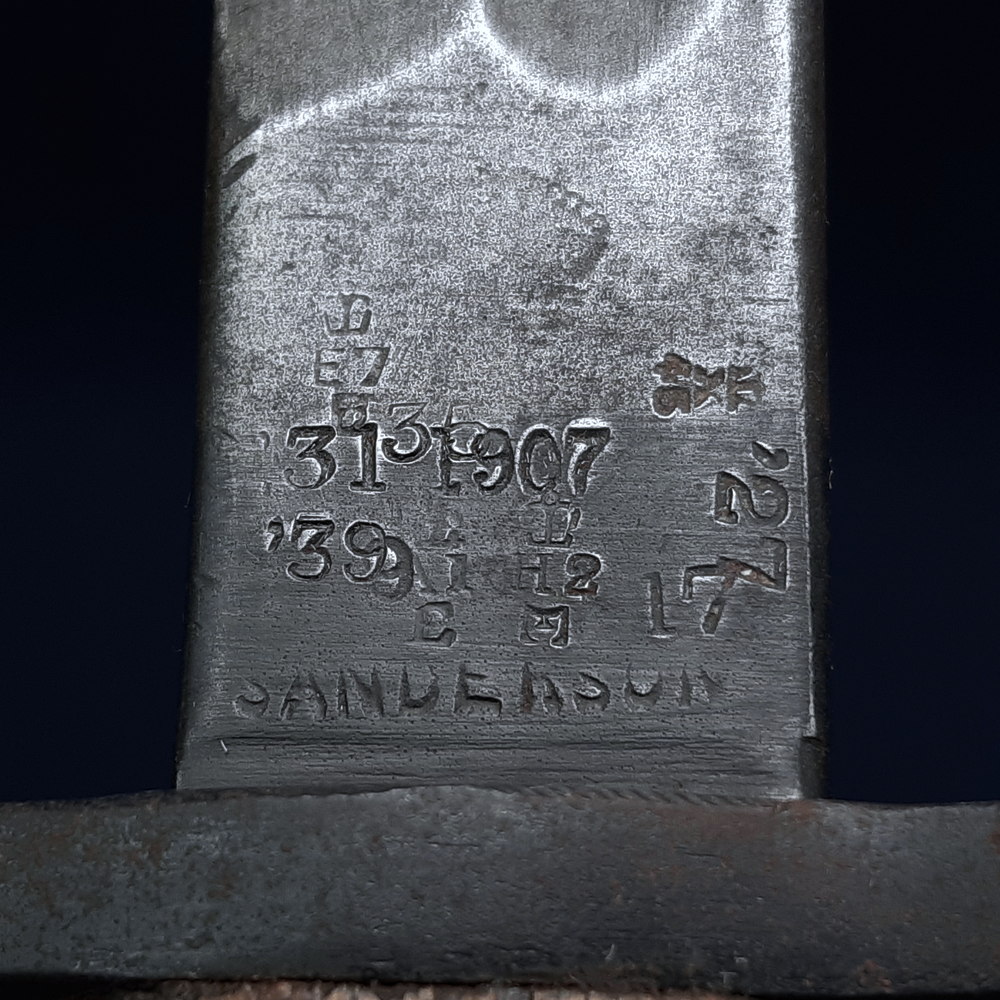 The ricasso is stamped on one side with a crown, 1907 (the pattern) ‘9 17’, indicating the manufacture date of September 1917, the manufacturer’s mark ‘SANDERSON’, four crown inspection stamps (three with ‘E’ indicating the Royal Small Arms Factory at Enfield), and multiple reissue stamps dated ’27, ’31 and ’39. On the other side it is stamped with a ‘broad arrow’ War Department stores mark, three more crown inspection stamps with ‘E’, and an ‘X’ indicating that it passed a manufacturer’s bending test.