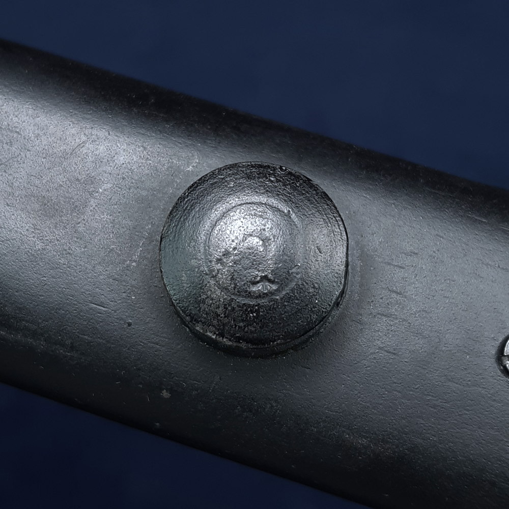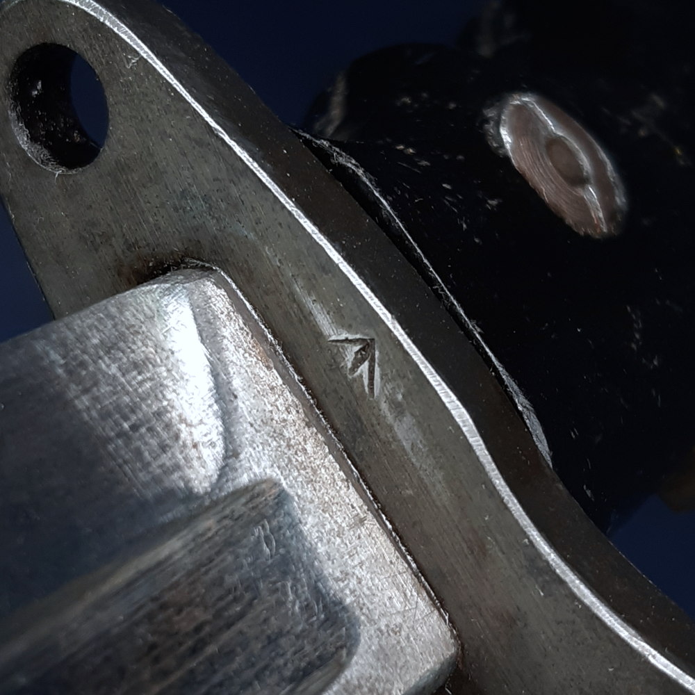 The grips of these bayonets vary in colour due to different materials and formulations used to produce these early composite materials, but are generally red, shading towards brown in some examples. Black grips are a known variation and I have so far seen them predominantly on examples by B.S.A., and occasionally by Elkington – they are interchangeable parts however, so could readily have been swapped between bayonets of whatever make.