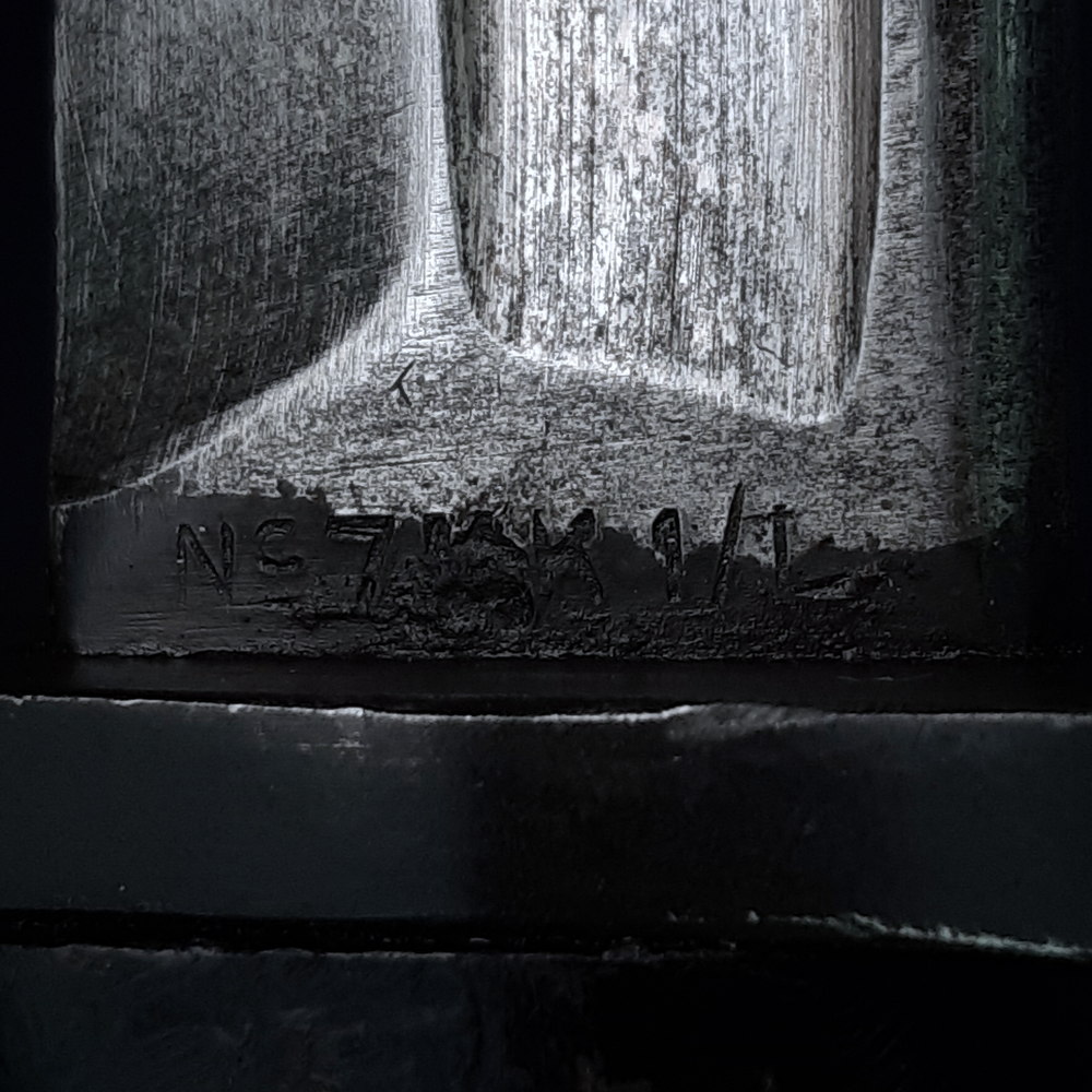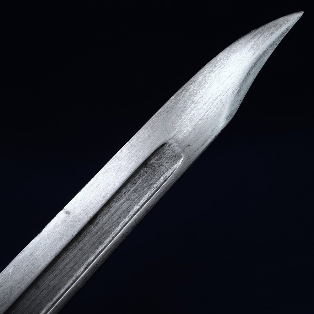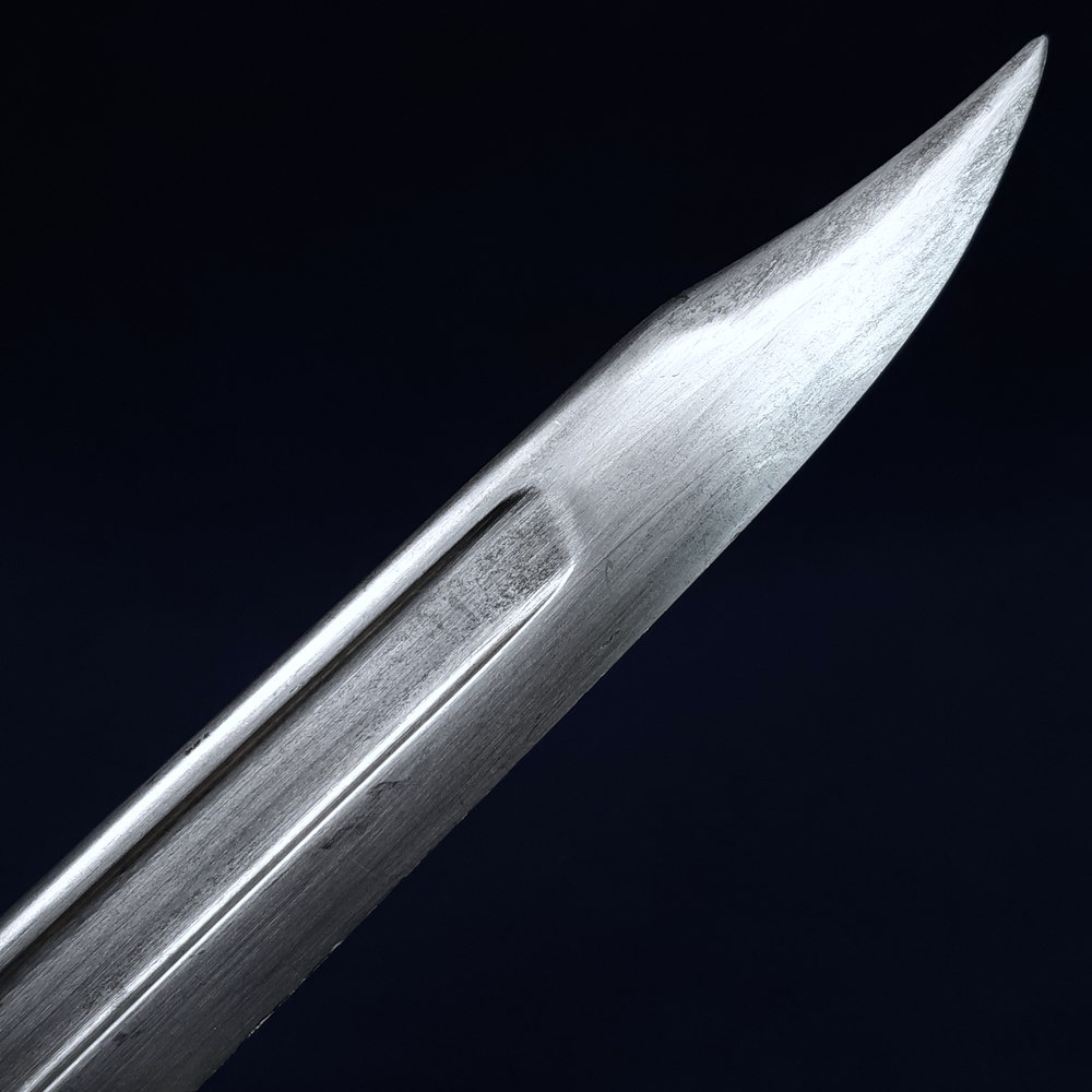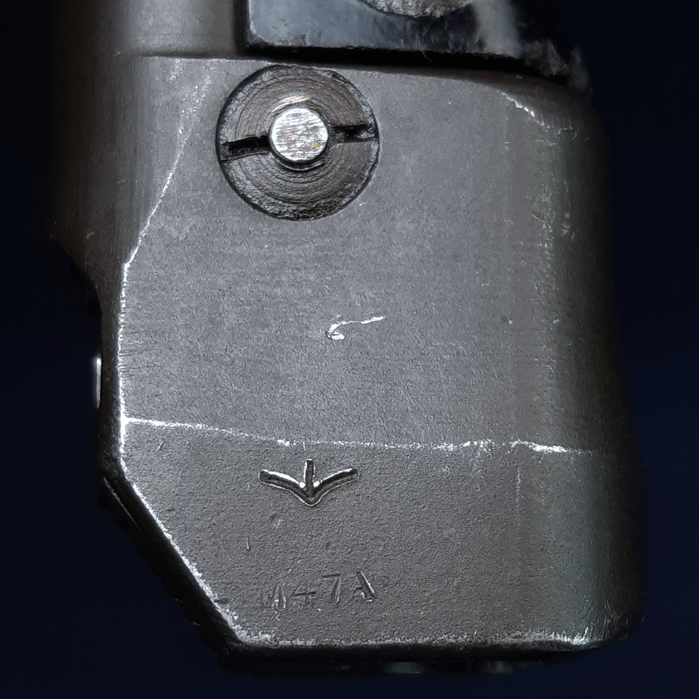 The blade is stamped on one side at the ricasso with ‘No 7 MK 1/L’. The pommel is stamped on one side with a broad arrow War Department mark and ‘M47A’, indicating manufacture by the Birmingham Small Arms Company (B.S.A.), specifically their plant at Small Heath, Birmingham, which was assigned the dispersal code M47A during WW2. The flat of the hilt on the blade side and the frog stud of the scabbard are both stamped with a broad arrow.