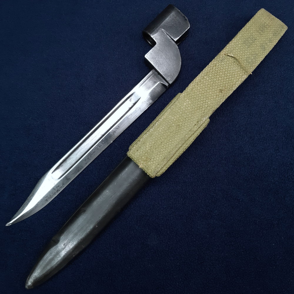The No. 9 was the last model of bayonet produced for the Lee Enfield No.4 rifle, and followed the No. 7 rotating bayonet with a mechanically simpler attempt at a bayonet that was also useful as a knife, using the No. 7’s blade and scabbard but attached to the simple forged socket of the wartime No. 4.
