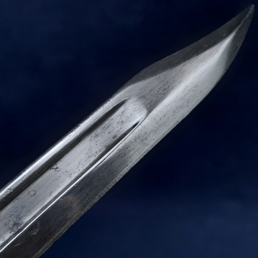 The blade has some spots of patination and of cleaned pitting, including pitting at the tip on one side. Its edge has been sharpened. The bluing of the socket is intact apart from rubbing at raised edges, and the band of bluing remains at the base of the blade. The scabbard has two small dents and one larger dent on the reverse side, its bluing is likewise rubbed in places.