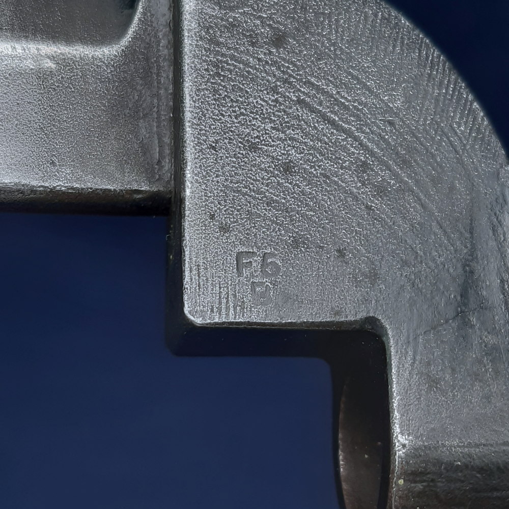 The locking button is stamped with a broad arrow. The socket is stamped on one side with ‘F5’ over ‘B’. The reverse side of the frog’s belt loop is inked with markings, but these are so faint as to be illegible.