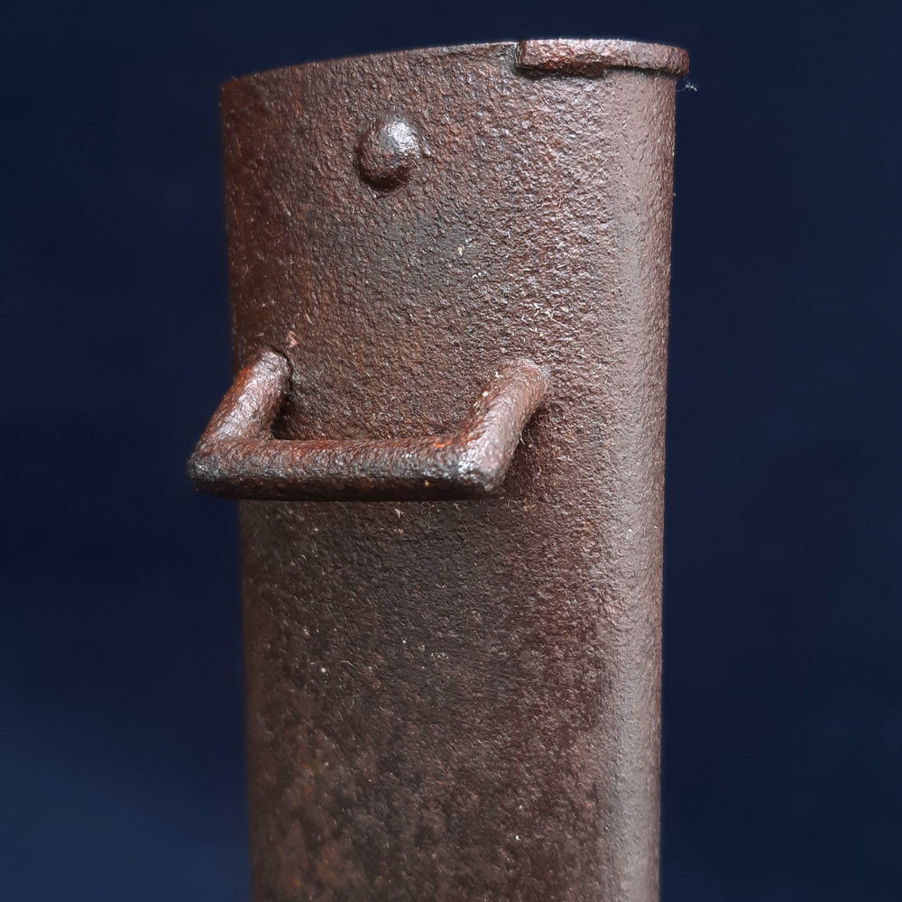 Its scabbard is a modified version of the standard M1866 scabbard: identical in its upper section but in its lower section it remains straight rather than curving as the M1866 must to accommodate a yataghan blade. It is oversized in length relative to the bayonet it holds. They were finished in bright steel, never blued.